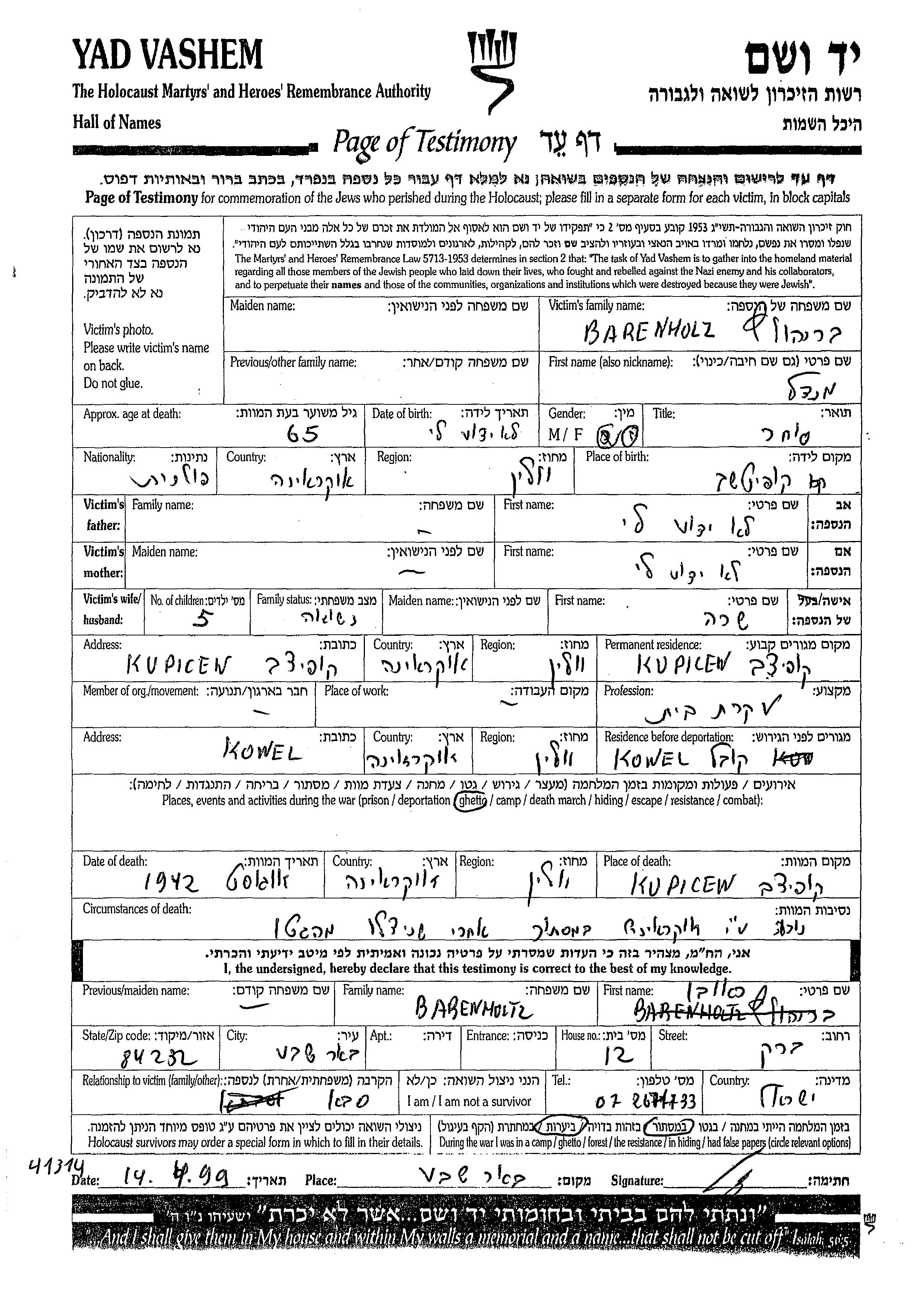 Mendel Barenholtz was born in Kupichev, Poland. He was a merchant and married to Sara. Prior to WWII he lived in Kupichev, Poland. During the war he was in Kowel, Poland. Mendel was murdered in the Shoah. Place of death: Kupichev, Poland, 08/1942.