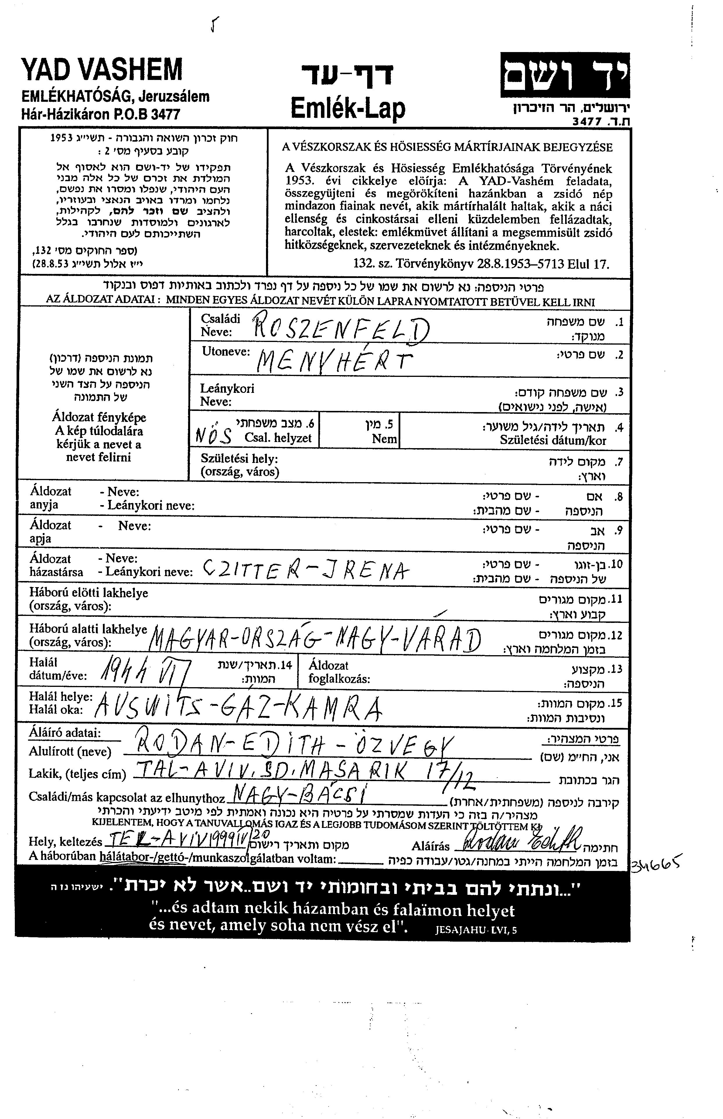 Menyhert Roszenfeld. He was married to Czitter Irena. During the war he was in Nagyvarad, Romania.