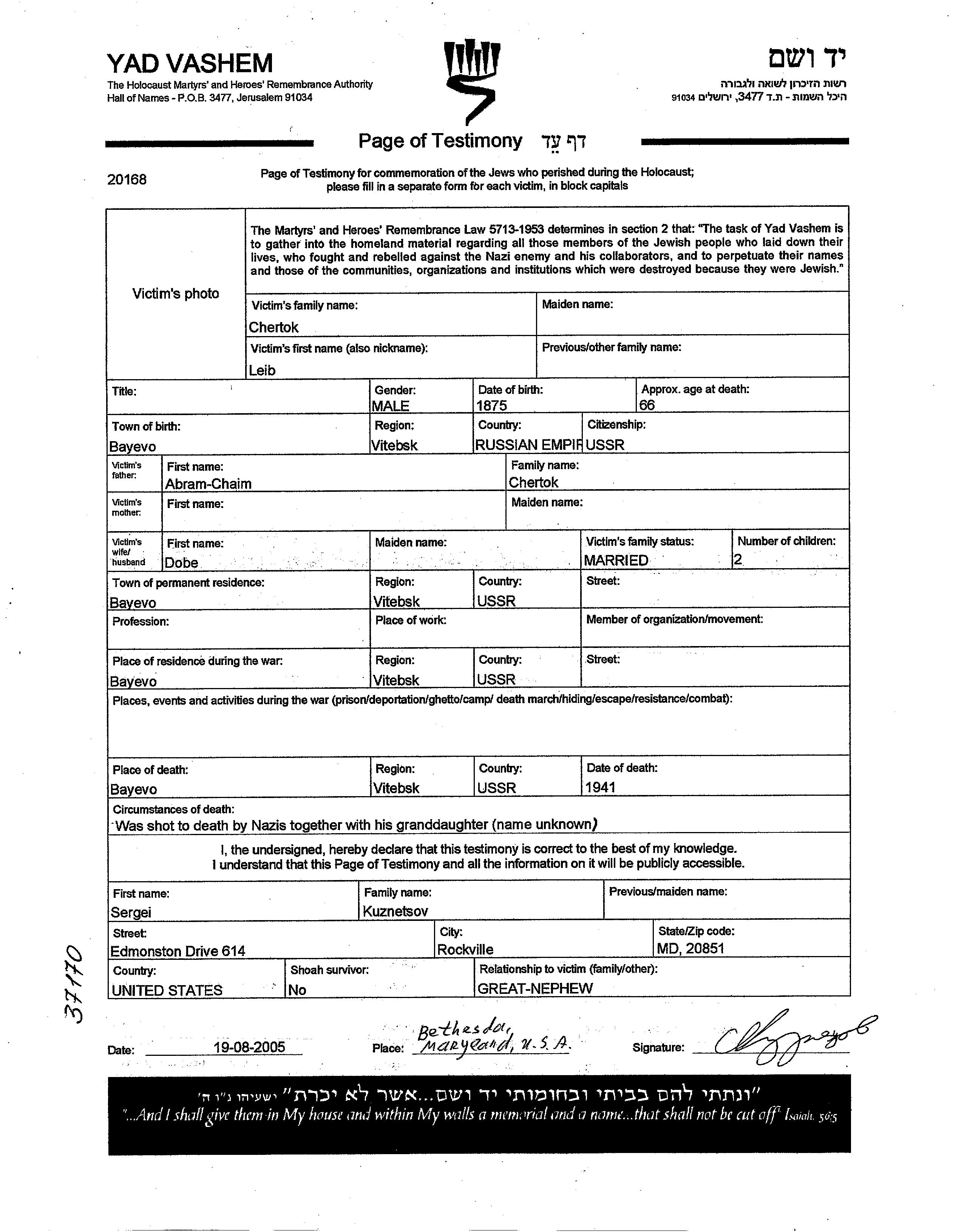 Leib Chertok was born in Bayevo, Belorussia (USSR), 1875 to Chaim Abram. He was married to Dobe. Prior to WWII he lived in Bayevo, Belorussia (USSR). During the war he was in Bayevo, Belorussia (USSR). Leib was murdered in the Shoah. Place of death: Bayevo, Belorussia (USSR), 1941.