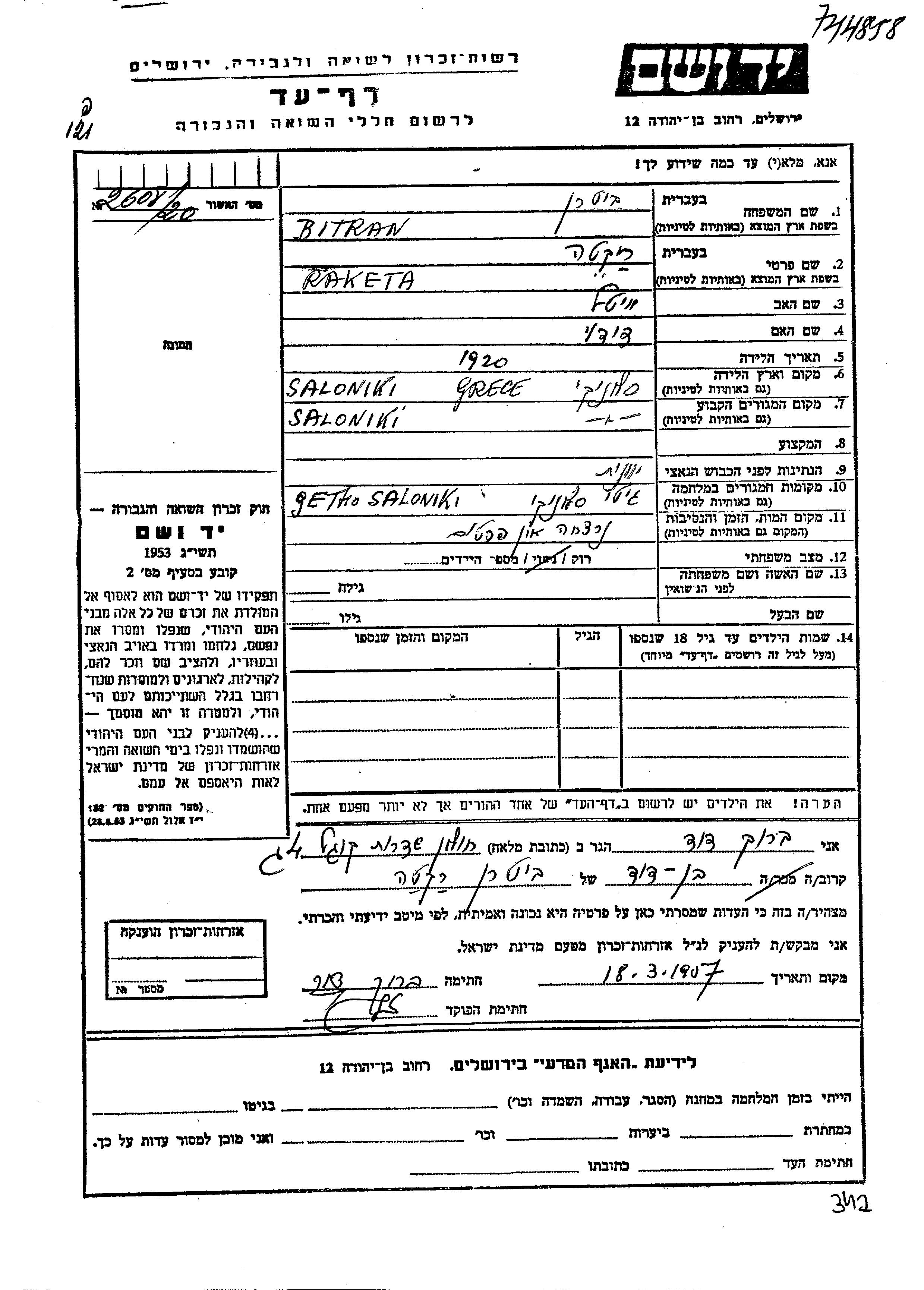 Bitran Reketa 1920 Saloniki, Greece Page of Testimony