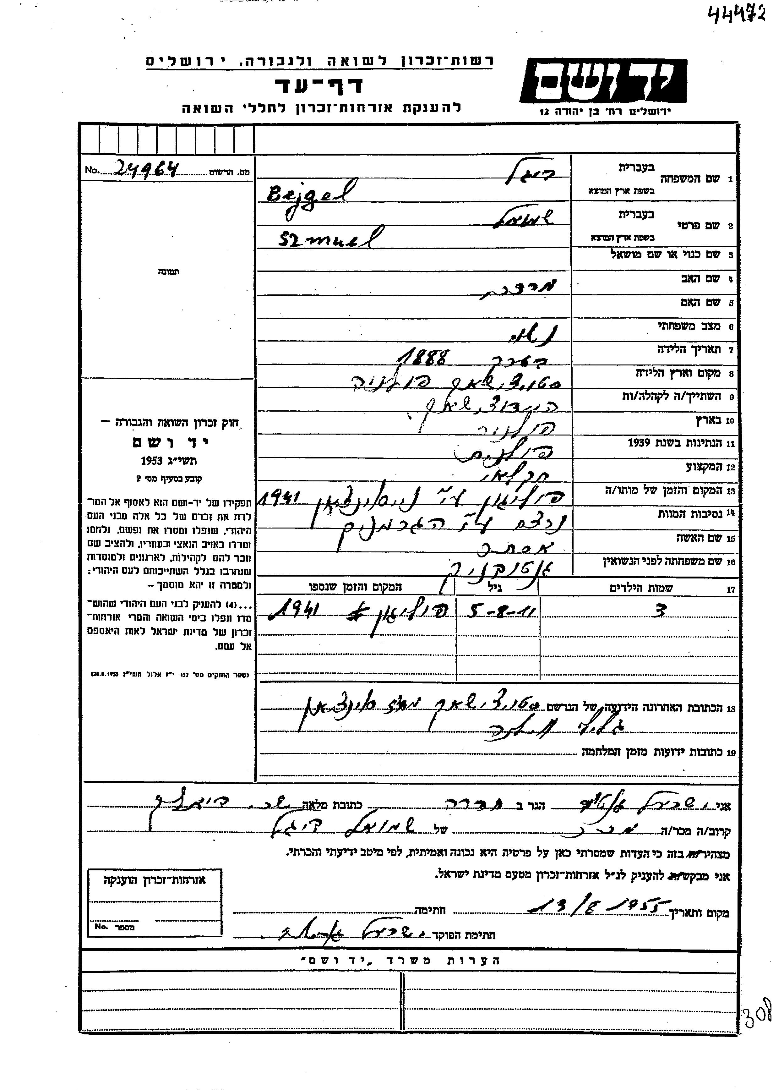 Szmuel Beigel was born in Stojaciszki, Poland, 1888 to Mordekhai. He was an agriculturist and married to Ester nee Gantovnik. Prior to WWII he lived in Stojaciszki, Poland. During the war he was in Stojaciszki, Poland. Szmuel was murdered in the Shoah. Place of death: Poligon, Poland, 1941.