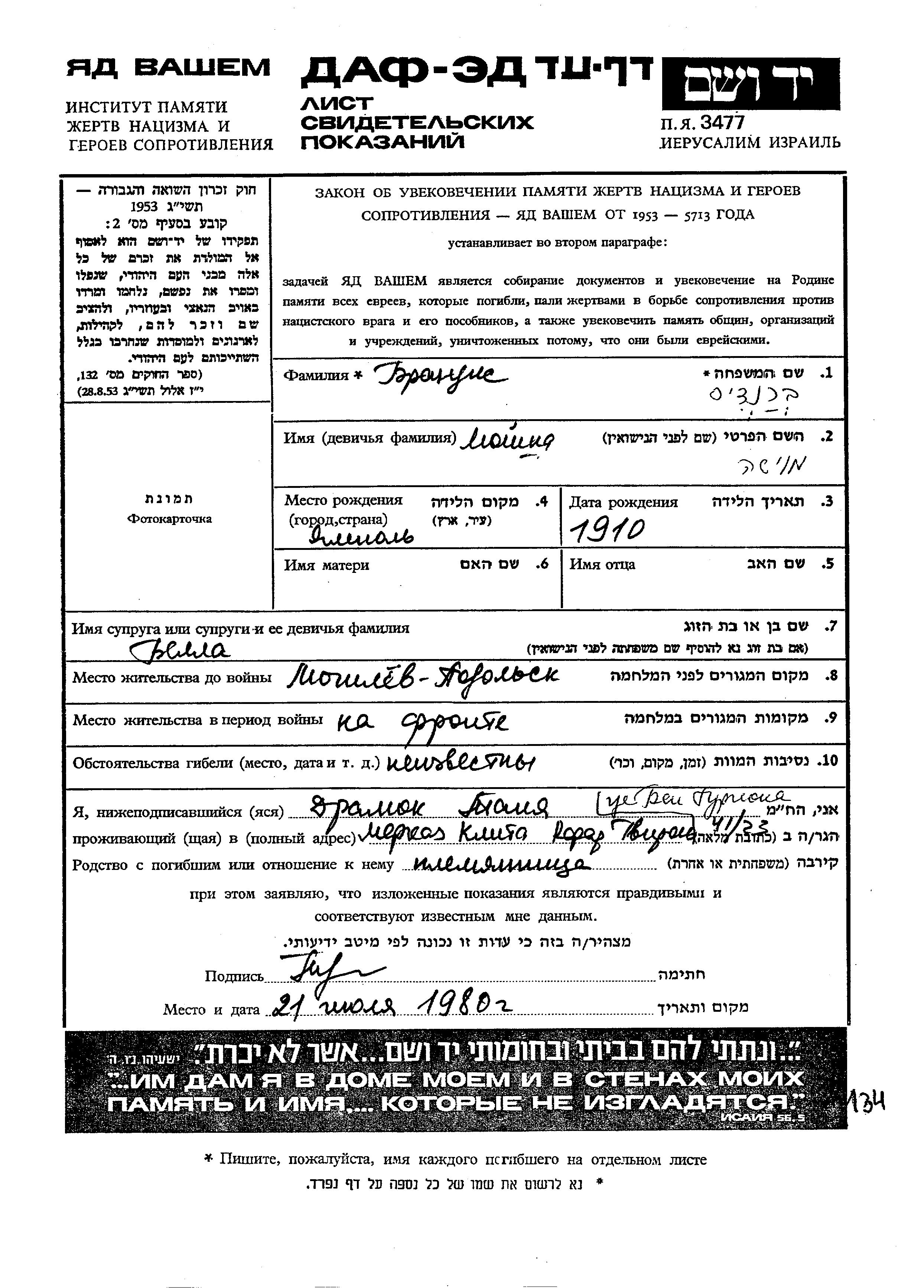 Moisha Brandis was born in Yampol, Ukraine (USSR), 1910. He was married to Bella. Prior to WWII he lived in Mogilev Podolski, Ukraine (USSR). During the war he was in the Soviet armed forces. Moisha was murdered in the Shoah.