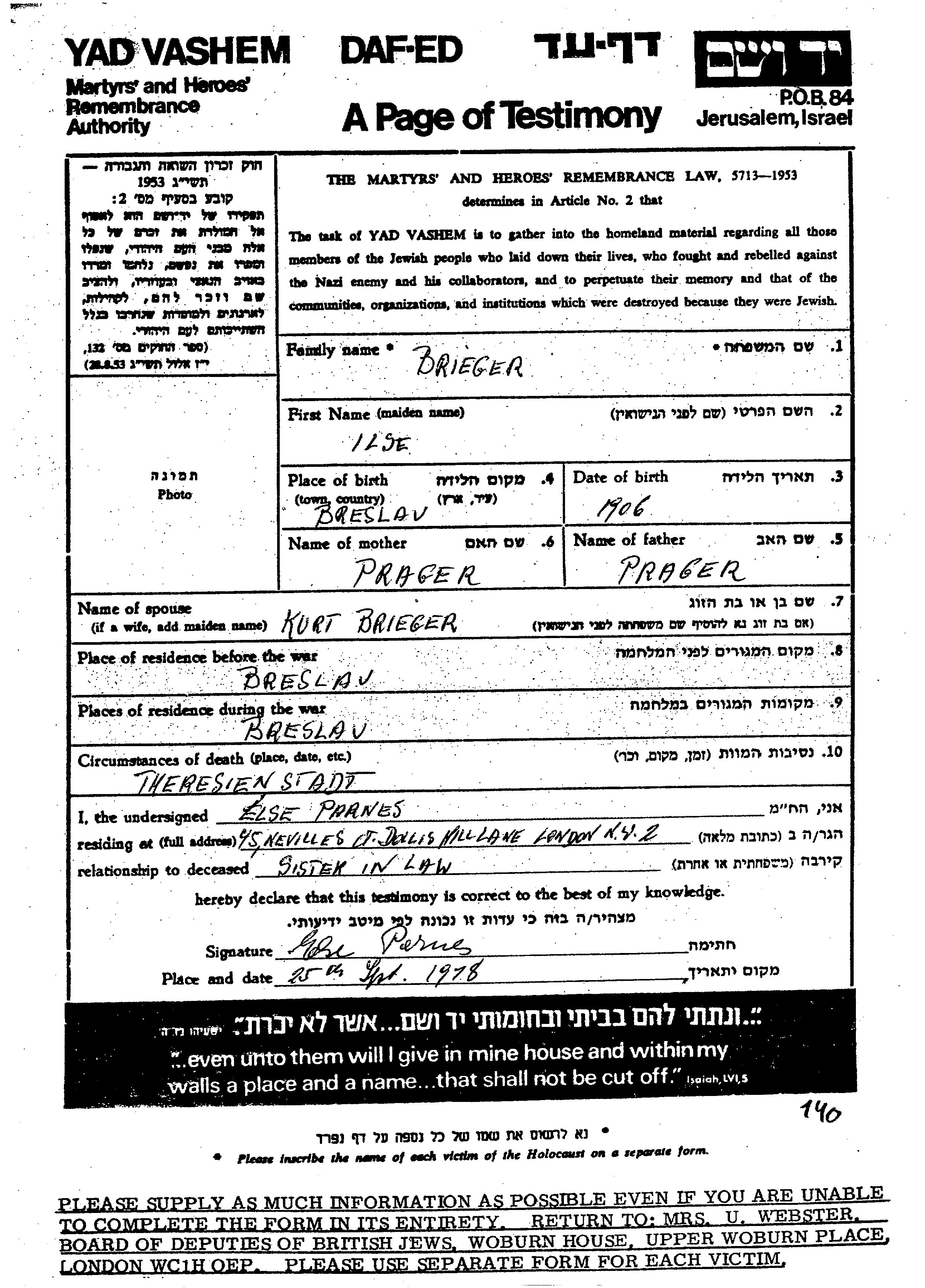 Ilse Brieger nee Prager was born in Breslau, Germany, 1906. She was married to Kurt. Prior to WWII she lived in Breslau, Germany. During the war she was in Breslau, Germany. Ilse was murdered in the Shoah. Place of death: Theresienstadt, Czechoslovakia.