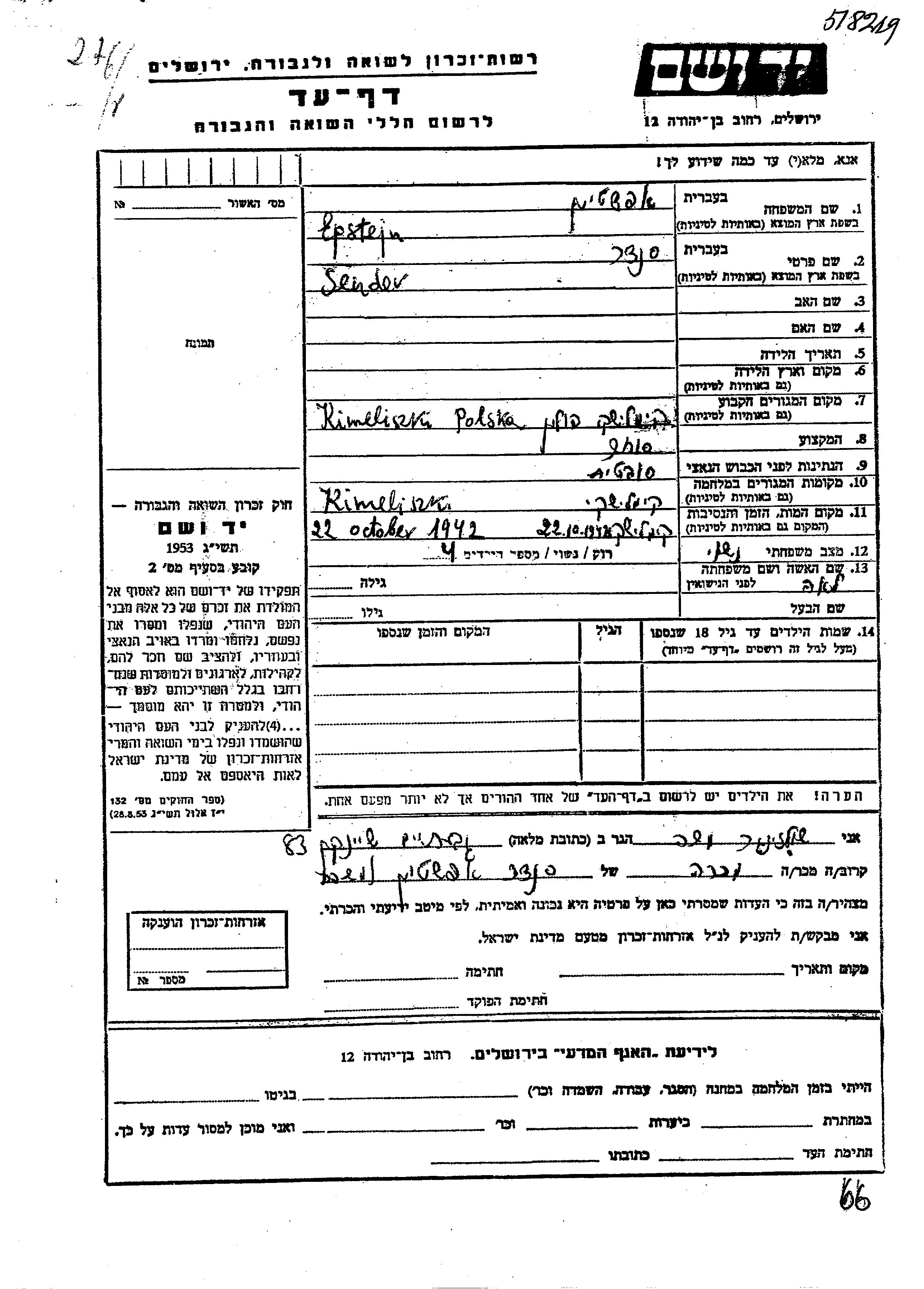 Sendor Epshtein. He was a merchant and married to Lea. Prior to WWII he lived in Kimeliszki, Poland. During the war he was in Kimeliszki, Poland. Sendor was murdered in the Shoah. Place of death: Kiemieliszki, Poland, 22/10/1942.