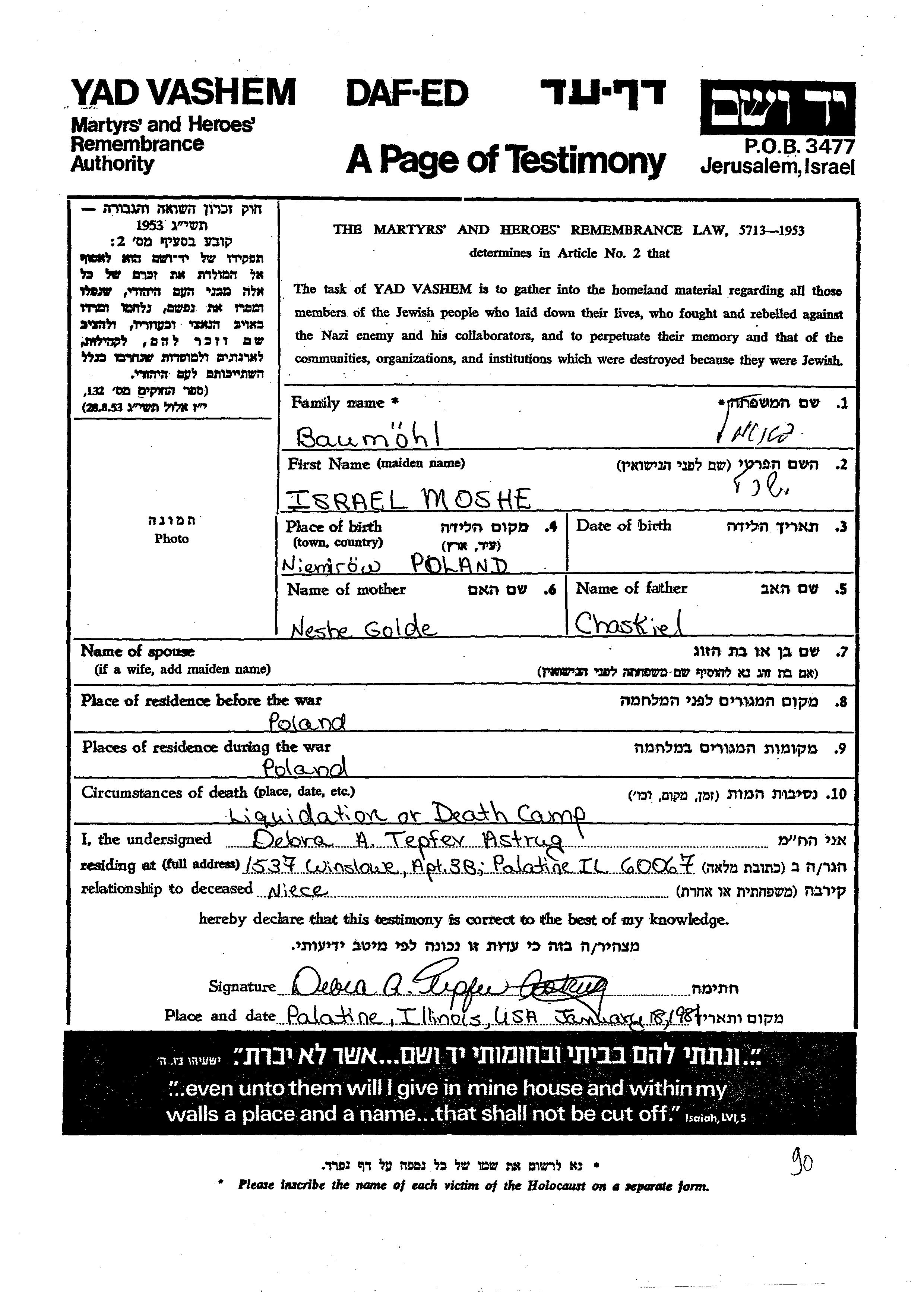 Israel Moshe Baumohl was born in Niemirów, Poland to Chaskiel and Neshe Golde. Prior to WWII he lived in Poland. During the war he was in Poland. Israel Moshe was murdered in the Shoah.