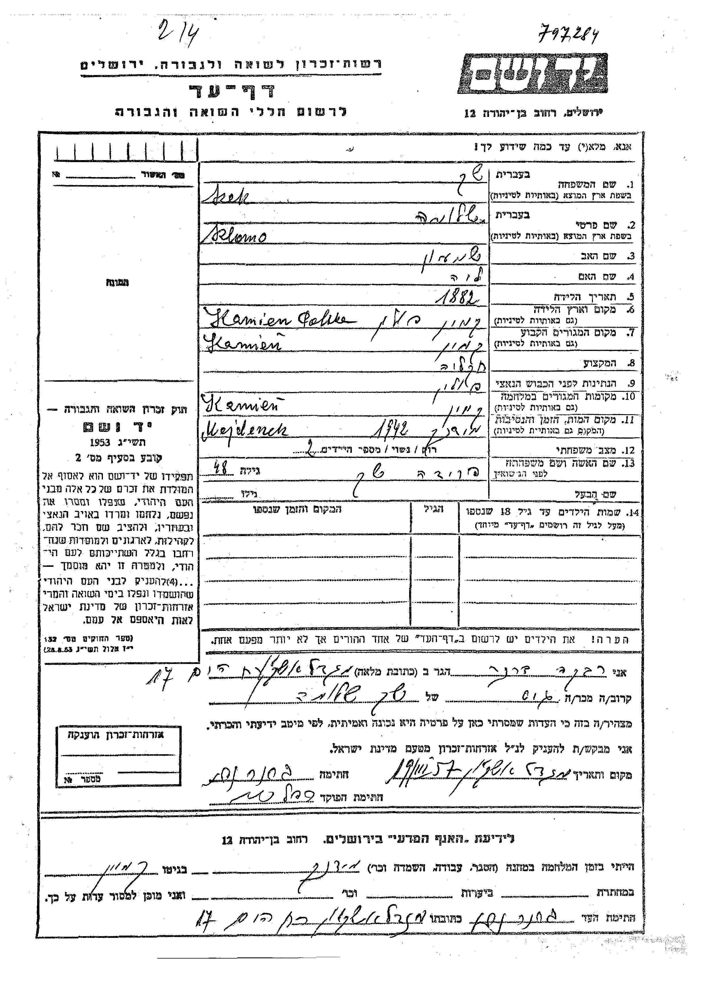 Szlomo Szek was born in Kamien, Poland, 1882 to Shimon and Liya. He was an agriculturist and married to Frida. Prior to WWII he lived in Kamien, Poland. During the war he was in Kamien, Poland. Szlomo was murdered in the Shoah. Place of death: Majdanek, Poland, 1942.