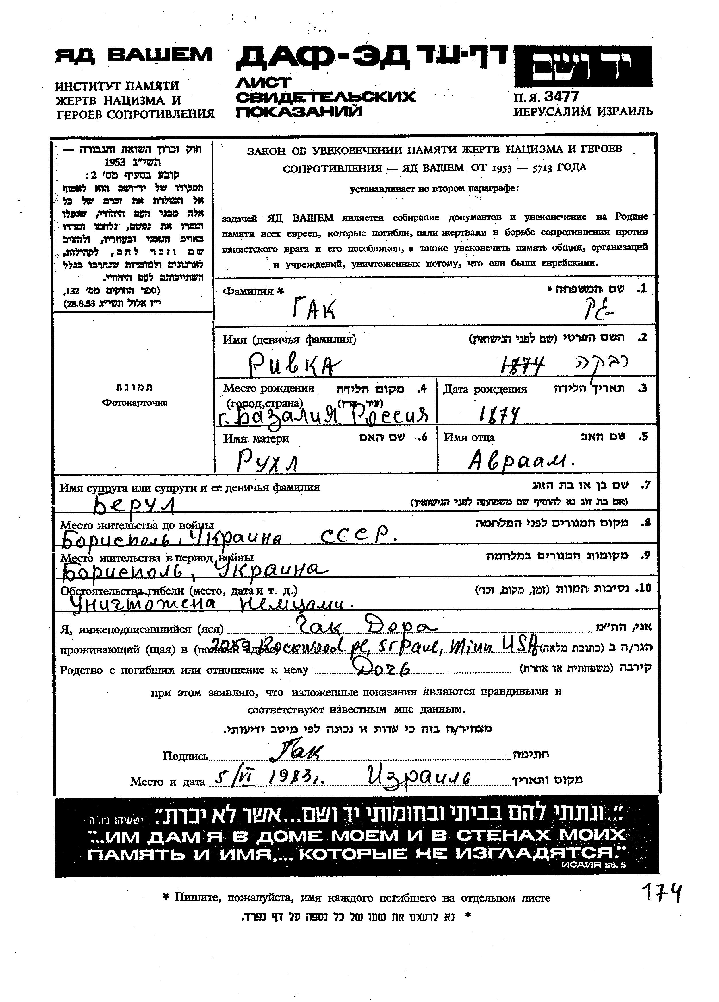 Rivka Gak was born in Bazaliya, Ukraine (USSR), 1874 to Avraam and Rukhl. She was married to Berul. Prior to WWII she lived in Borispol, Ukraine (USSR). During the war she was in Borispol, Ukraine (USSR).