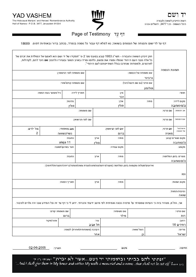 Grabiner Solomon Czenstochowa, Poland Page of Testimony (digital)