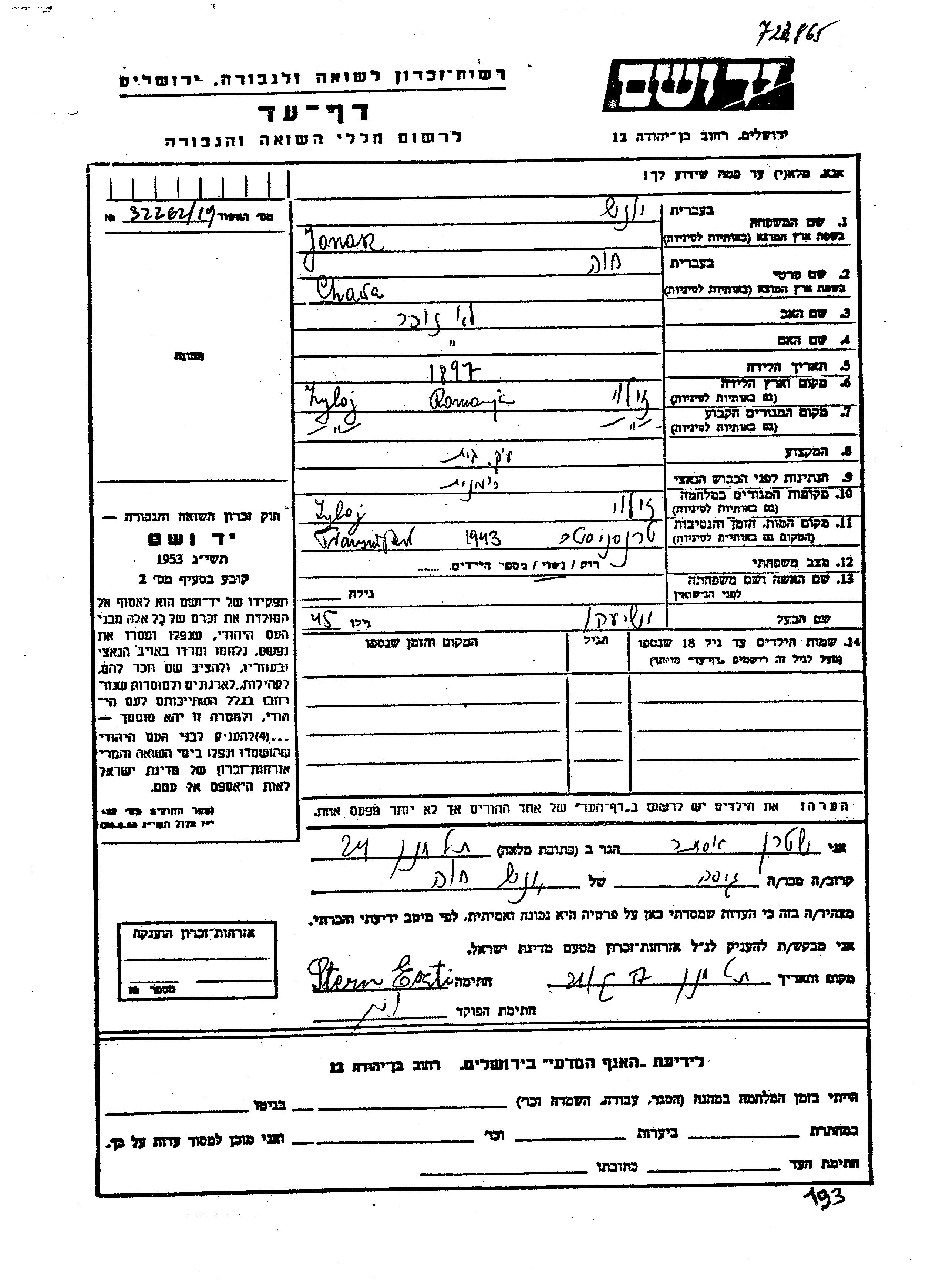 Yonas Khava 1897 Zyloj, Romania Page of Testimony