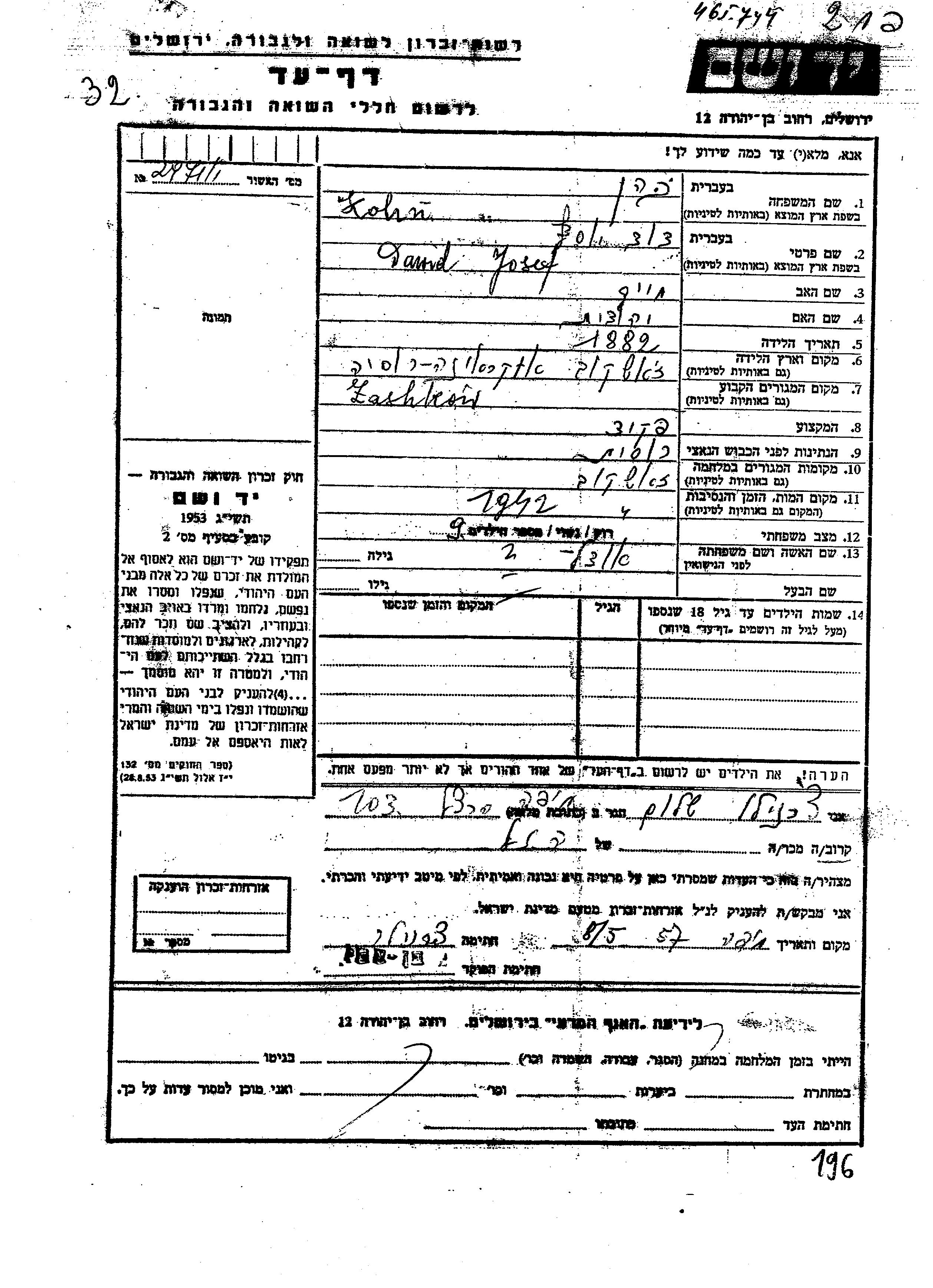 Yosef David Kohen was born in Zashkow, Poland, 1882 to Khaim and Yehudit. He was a clerk and married to Udel. Prior to WWII he lived in Zashkow, Poland. During the war he was in Zashkow, Poland. Yosef David was murdered in the Shoah. Place of death: Zashkow, Poland, 1942.