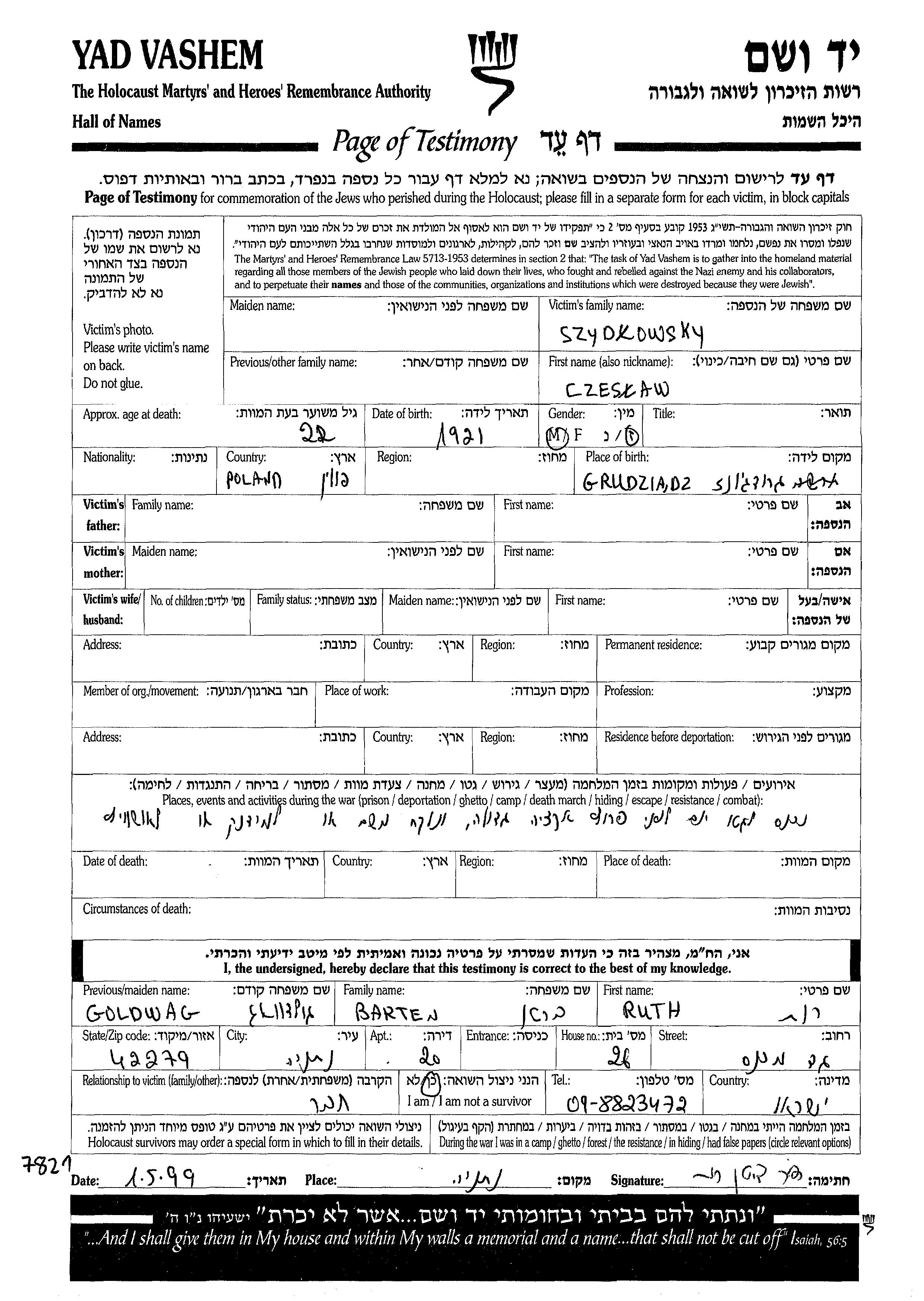 Szydlowsky Czeslaw 1921 Grudziadz, Poland Page of Testimony