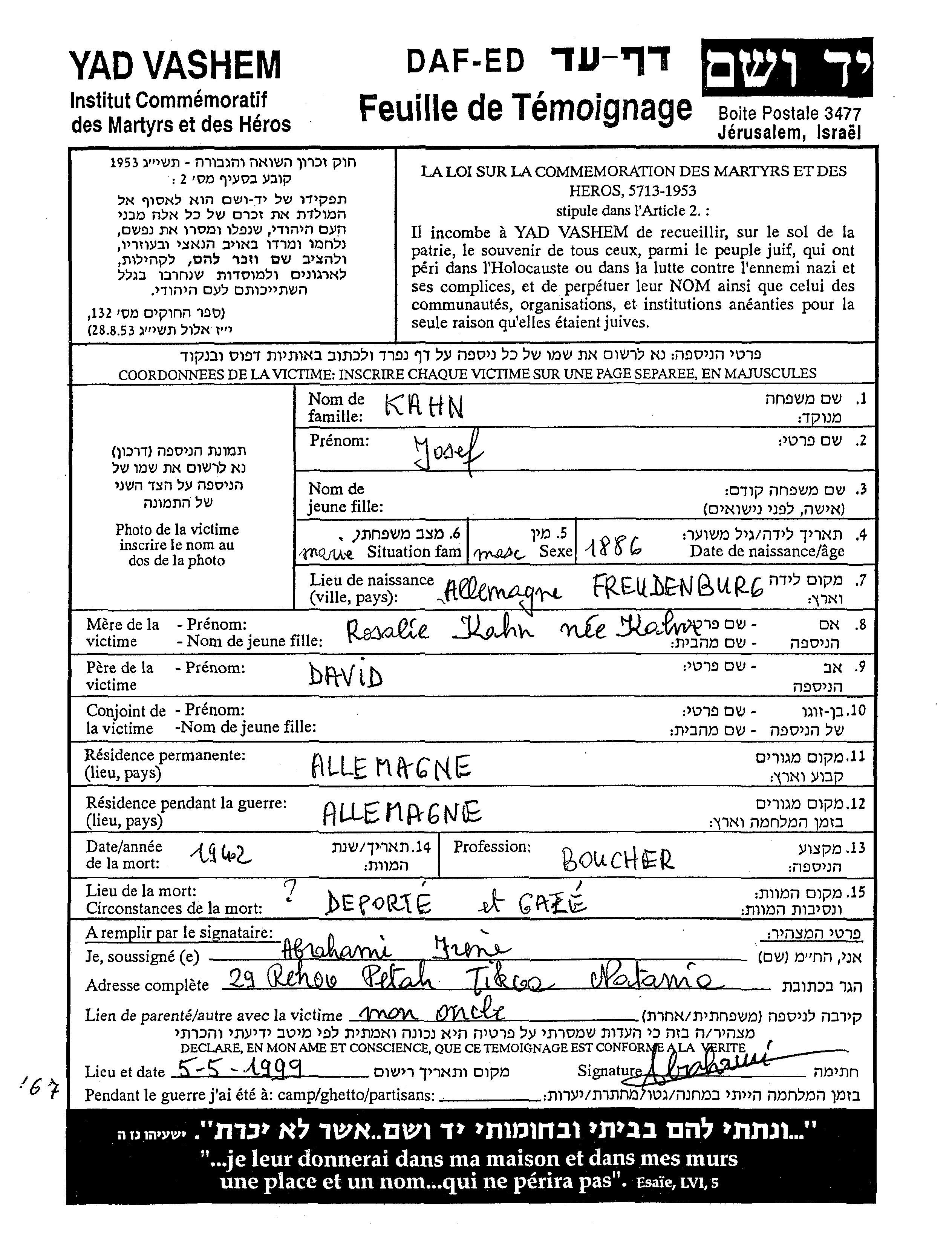Josef Kahn was born in Freudenburg, Germany, 1886 to David and Rosalie nee Kahn. He was a butcher and married. Prior to WWII he lived in Germany. During the war he was in Germany.