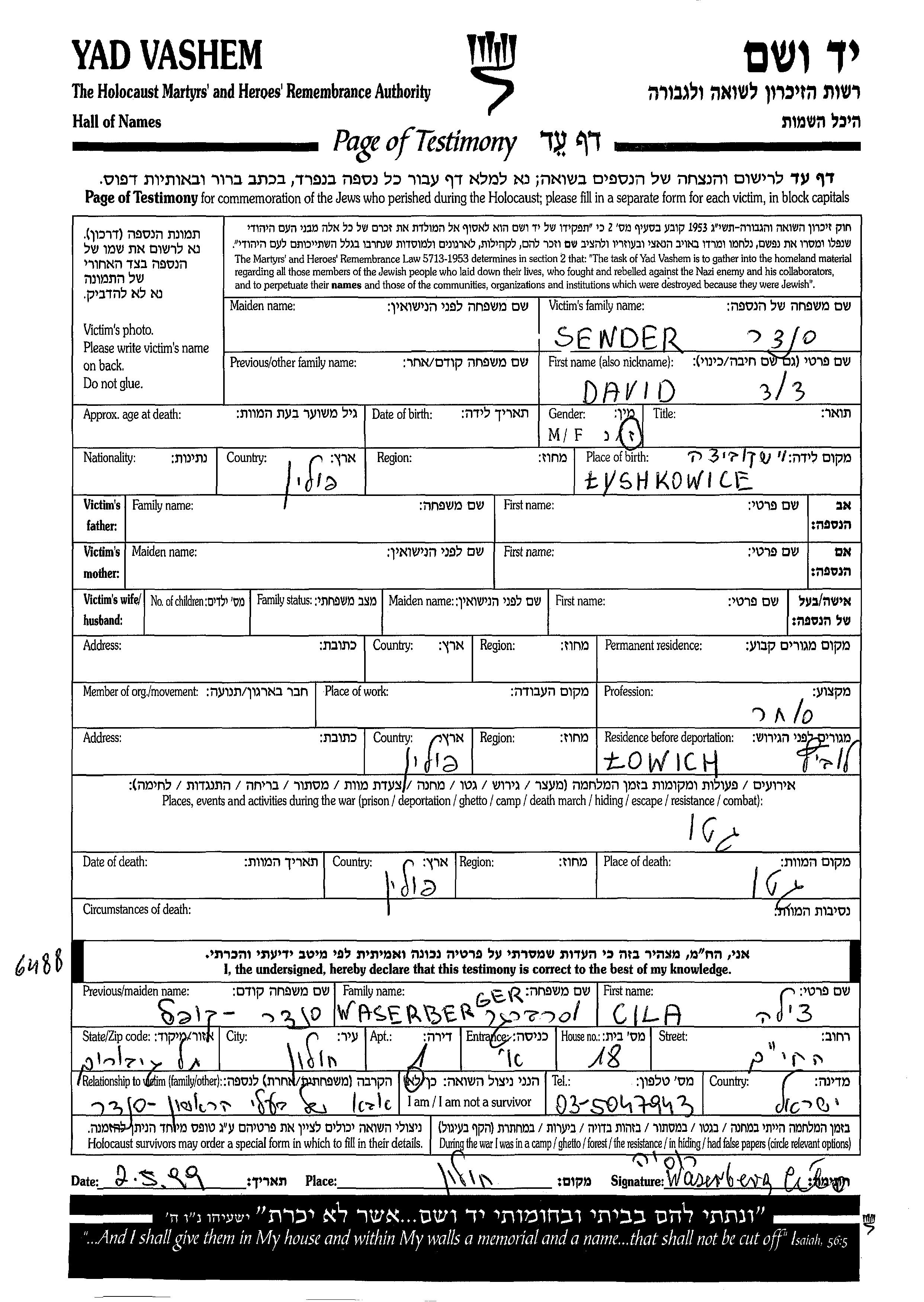 Sender David unstated place, Page of Testimony