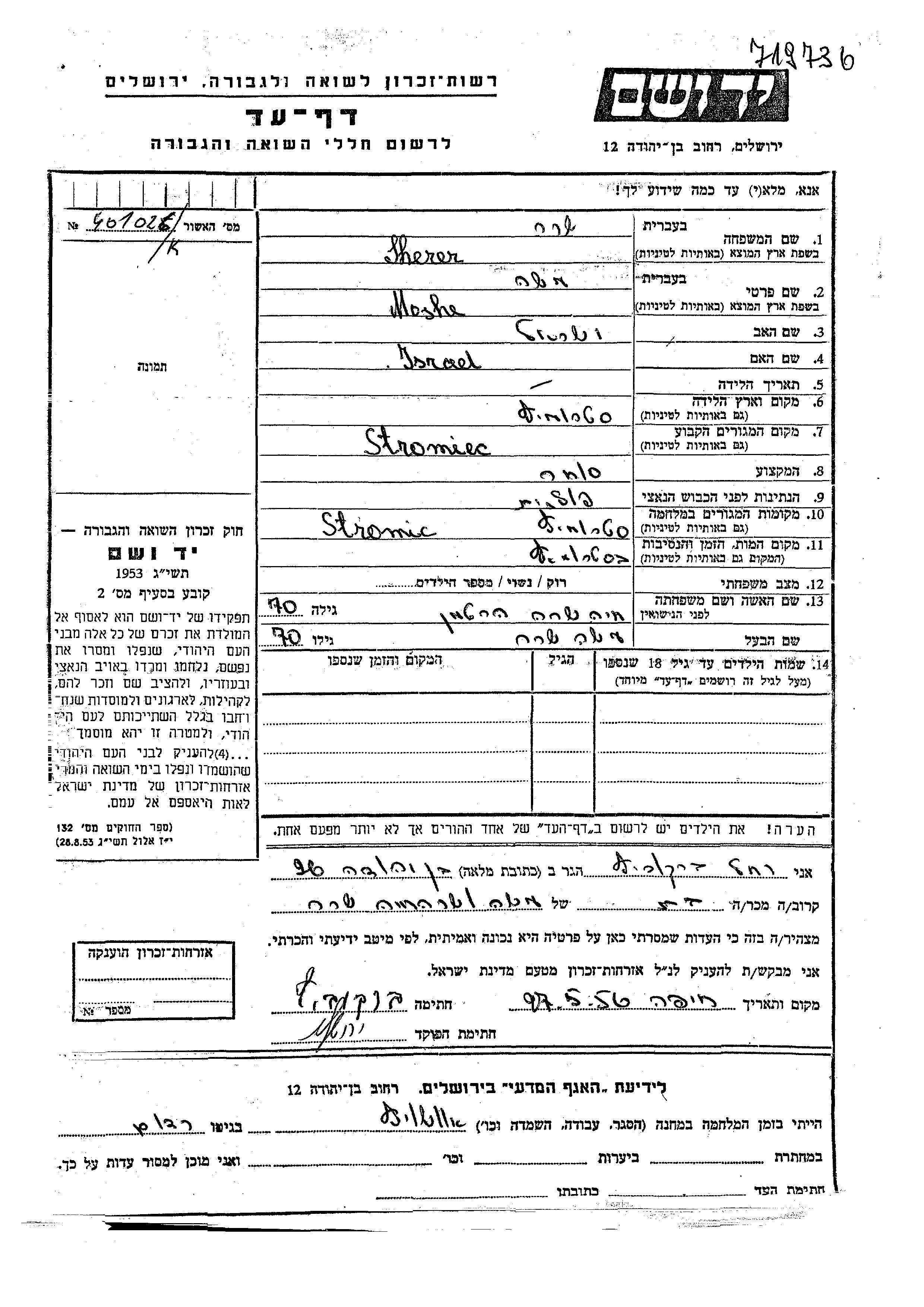 Moshe Sherer was born in Stromiec, Poland to Israel. He was a merchant. Prior to WWII he lived in Stromiec, Poland. During the war he was in Stromiec, Poland. Moshe was murdered in the Shoah. Place of death: Stromiec, Poland.
