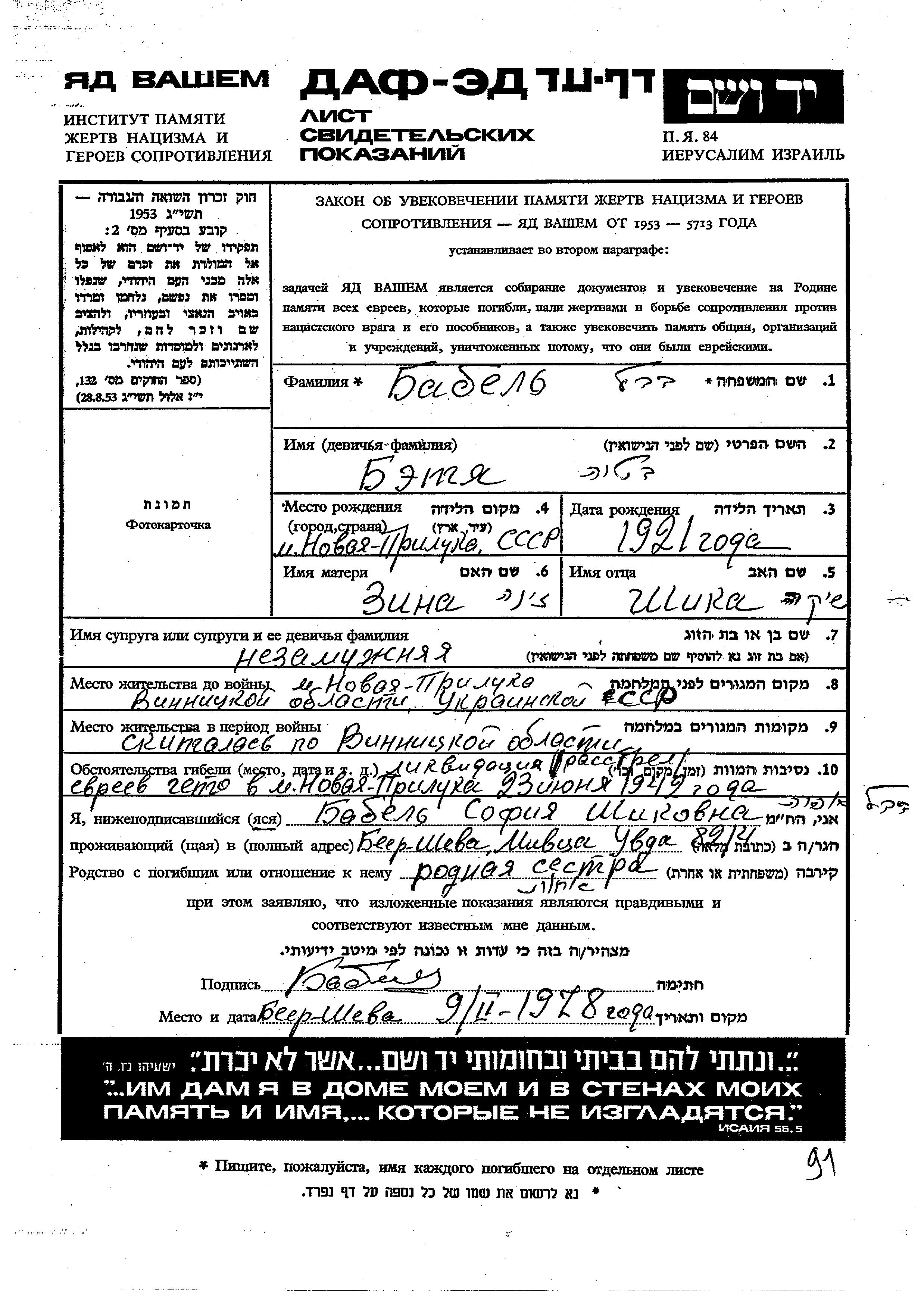 Betya Babel was born in Novaya Priluka, Ukraine (USSR), 1921 to Shika and Zina. She was single. Prior to WWII she lived in Novaya Priluka, Ukraine (USSR). During the war she was in Vinnitsa, Ukraine (USSR). Betya was murdered in the Shoah. Place of death: Novaya Priluka, Ukraine (USSR), 23/06/1942.