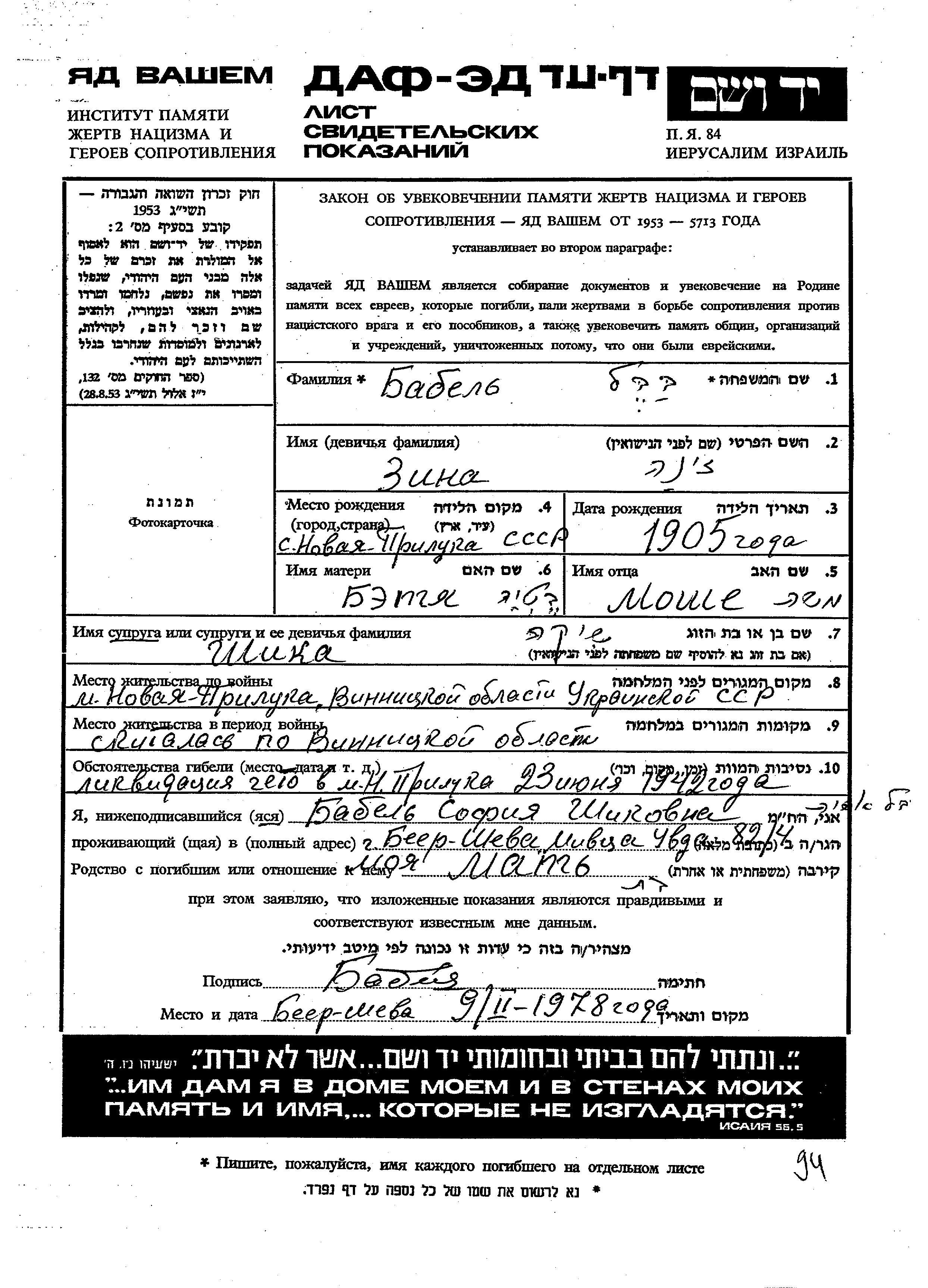 Zina Babel was born in Novaya Priluka, Ukraine (USSR), 1905 to Moshe and Betia. She was married to Shika. Prior to WWII she lived in Novaya Priluka, Ukraine (USSR). During the war she was in Vinnitsa, Ukraine (USSR). Zina was murdered in the Shoah. Place of death: Novaya Priluka, Ukraine (USSR), 23/06/1942.