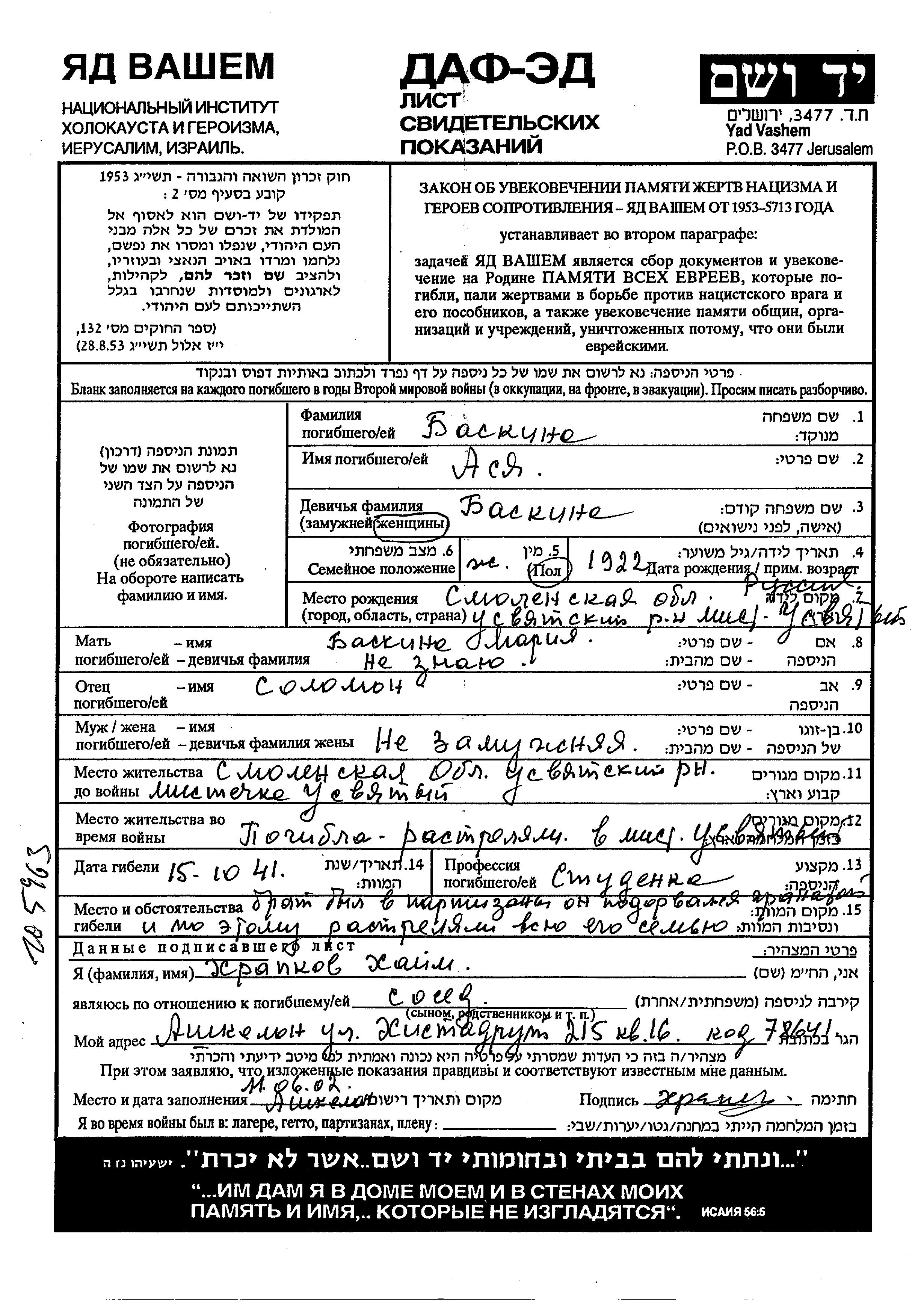 Asia Baskina was born in Usvyaty, Russia (USSR), 1922 to Solomon and Maria. She was a pupil. Prior to WWII she lived in Usvyaty, Russia (USSR). During the war she was in Usvyaty, Russia (USSR). Asia was murdered in the Shoah. Place of death: Usvyaty, Russia (USSR), 15/10/1941.