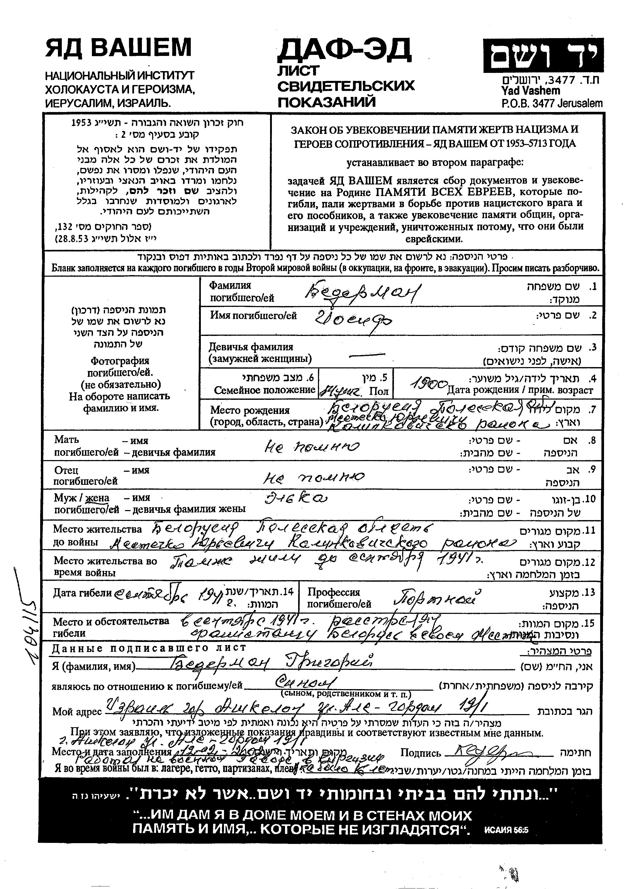 Bedermann Iosif 1900 Yurevichi, Belorussia (USSR) Page of Testimony
