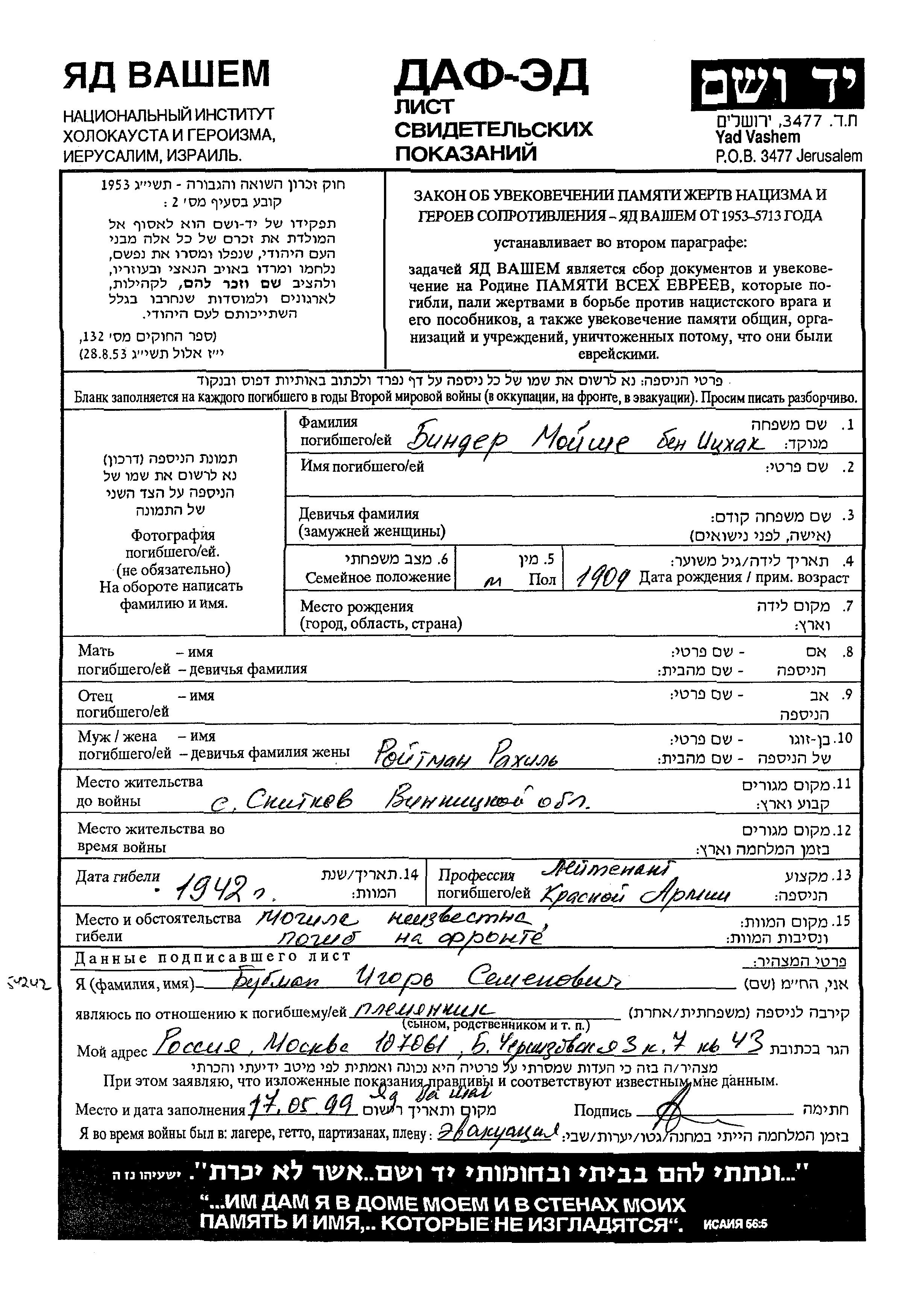 Moishe Binder was born, 1909. He was a leitenant and married to Rakhil nee Roitman. Prior to WWII he lived in Snitkov, Ukraine (USSR). During the war he was in the Soviet armed forces. Moishe was murdered in the Shoah. Place of death: unknown, 1942.
