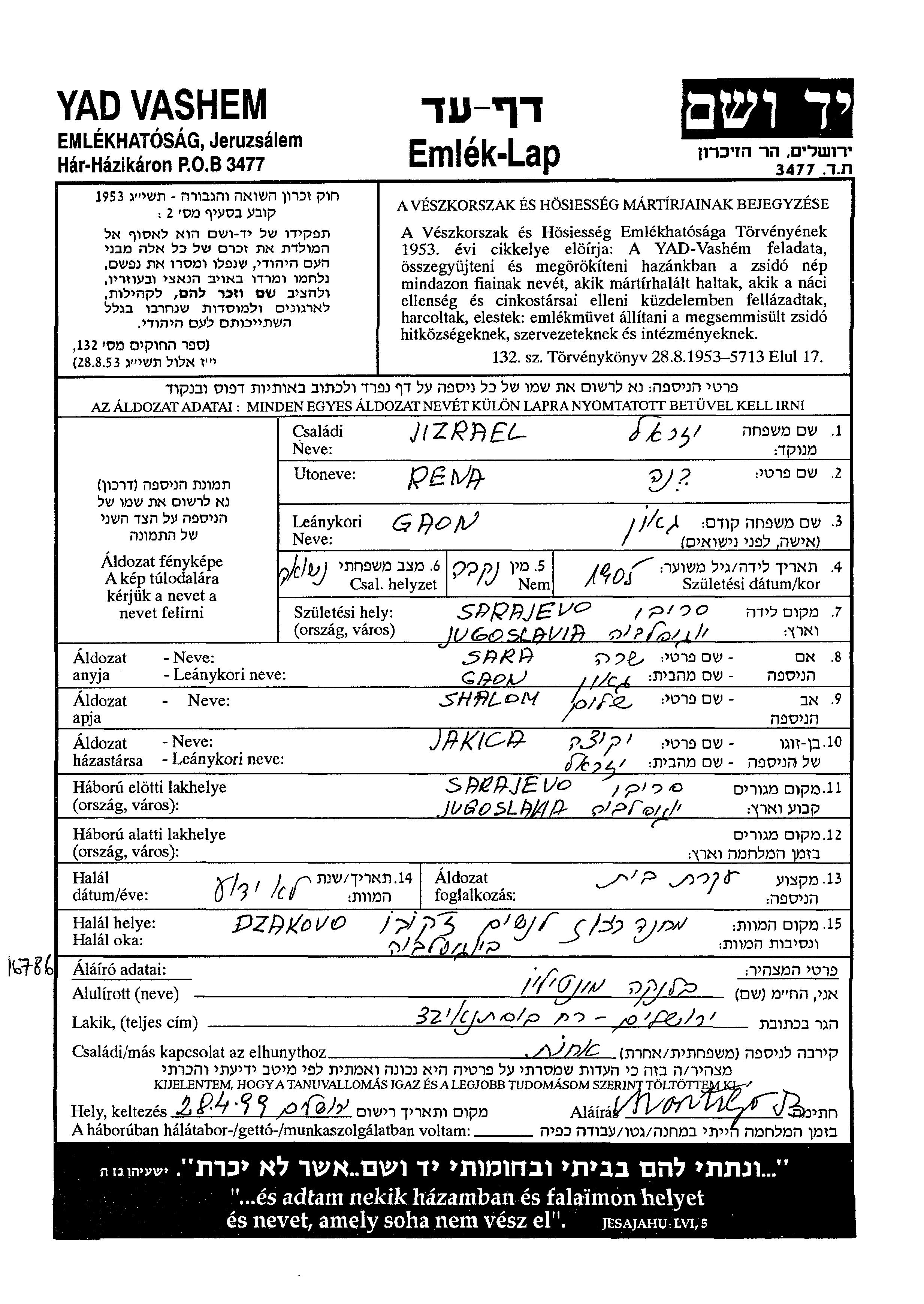 Israel Rena 1905 Sarajevo, Yugoslavia Page of Testimony