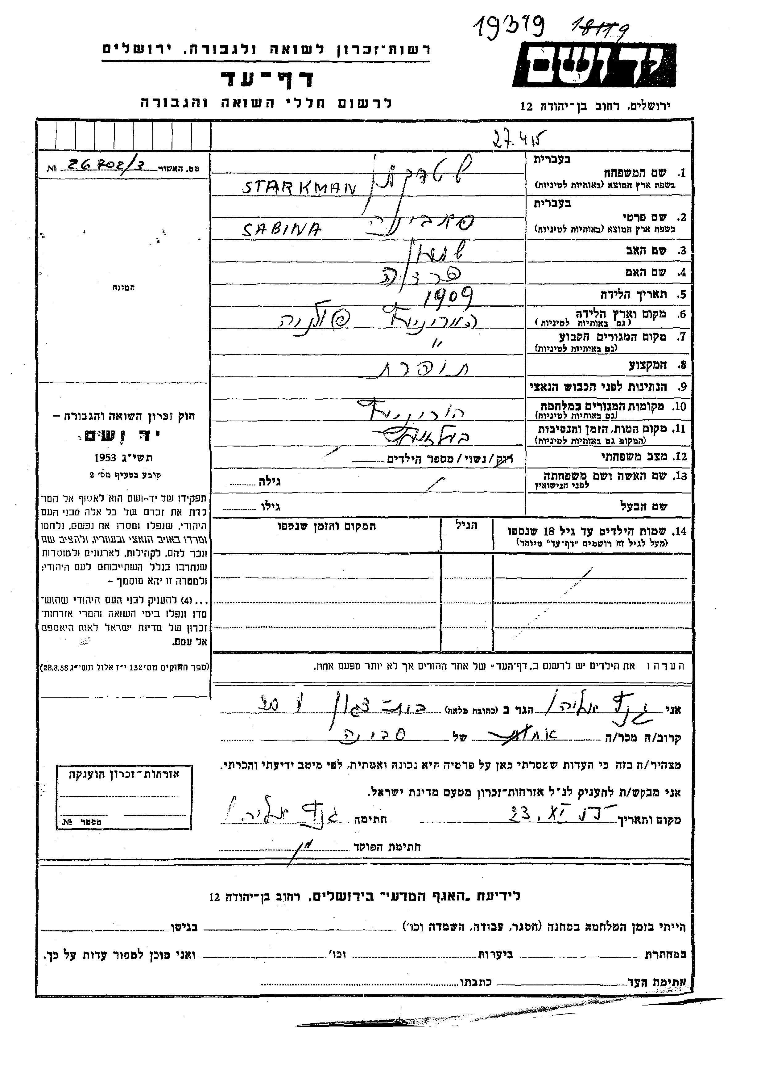 Sabina Starkman was born in Horyniec, Poland, 1909 to Shimon and Freda. She was a seamstress and married. Prior to WWII she lived in Horyniec, Poland. During the war she was in Horyniec, Poland. Sabina was murdered in the Shoah. Place of death: Belzec, Poland.