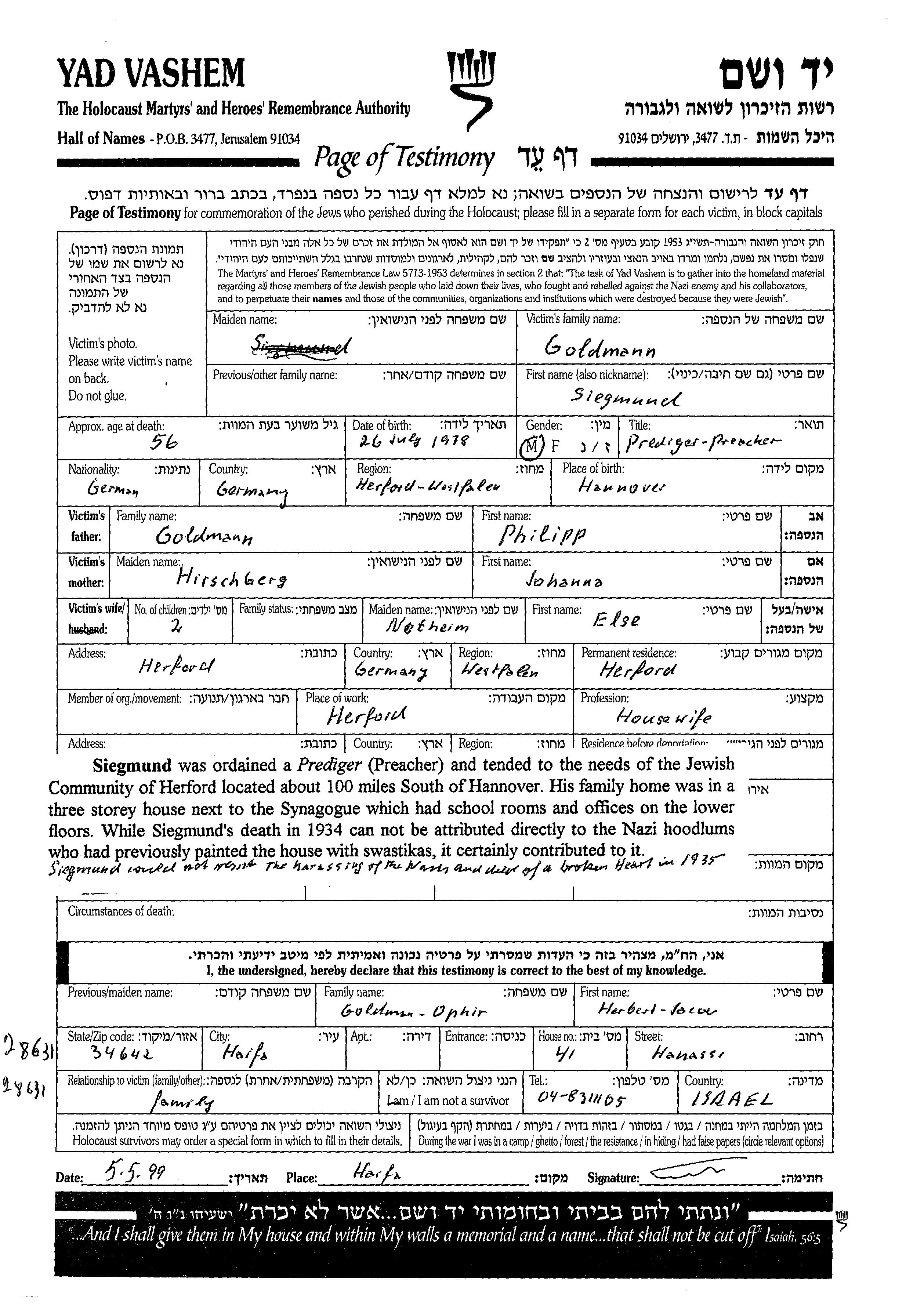 Siegmund Goldmann was born in Hannover, Germany, 1878 to Philipp and Johanna nee Hirschberg. He was a preacher and married to Else nee Netheim. Prior to WWII he lived in Herford, Germany. During the war he was in Herford, Germany. Siegmund was murdered in the Shoah. Place of death: Herford, Germany, 1935.
