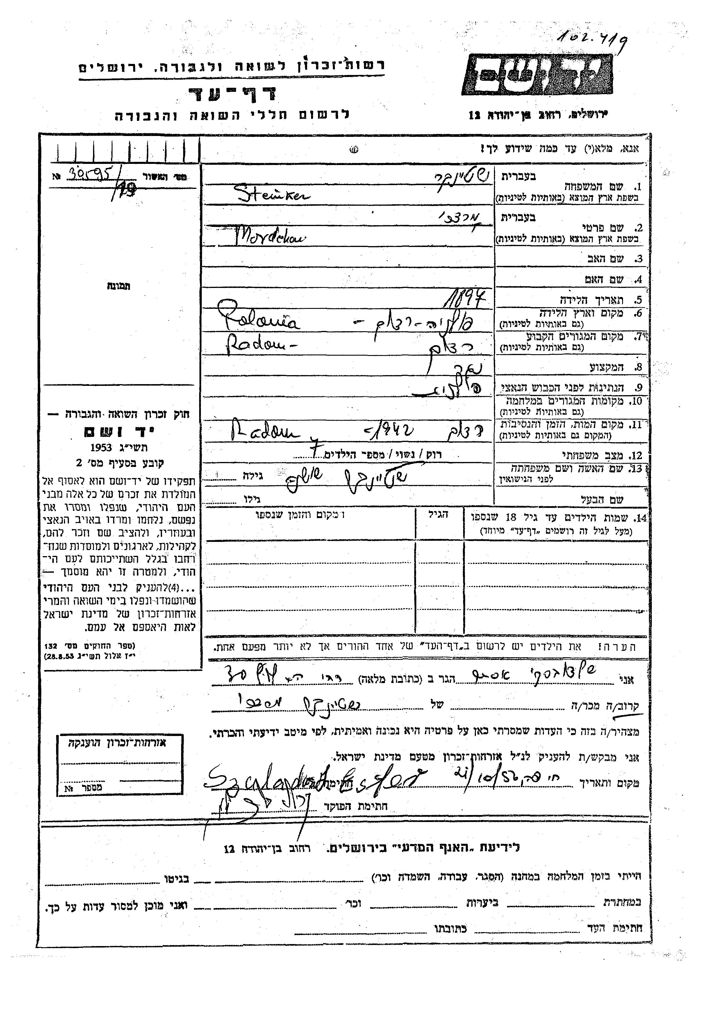 Steinker Mordekai 1897 Radom, Poland Page of Testimony