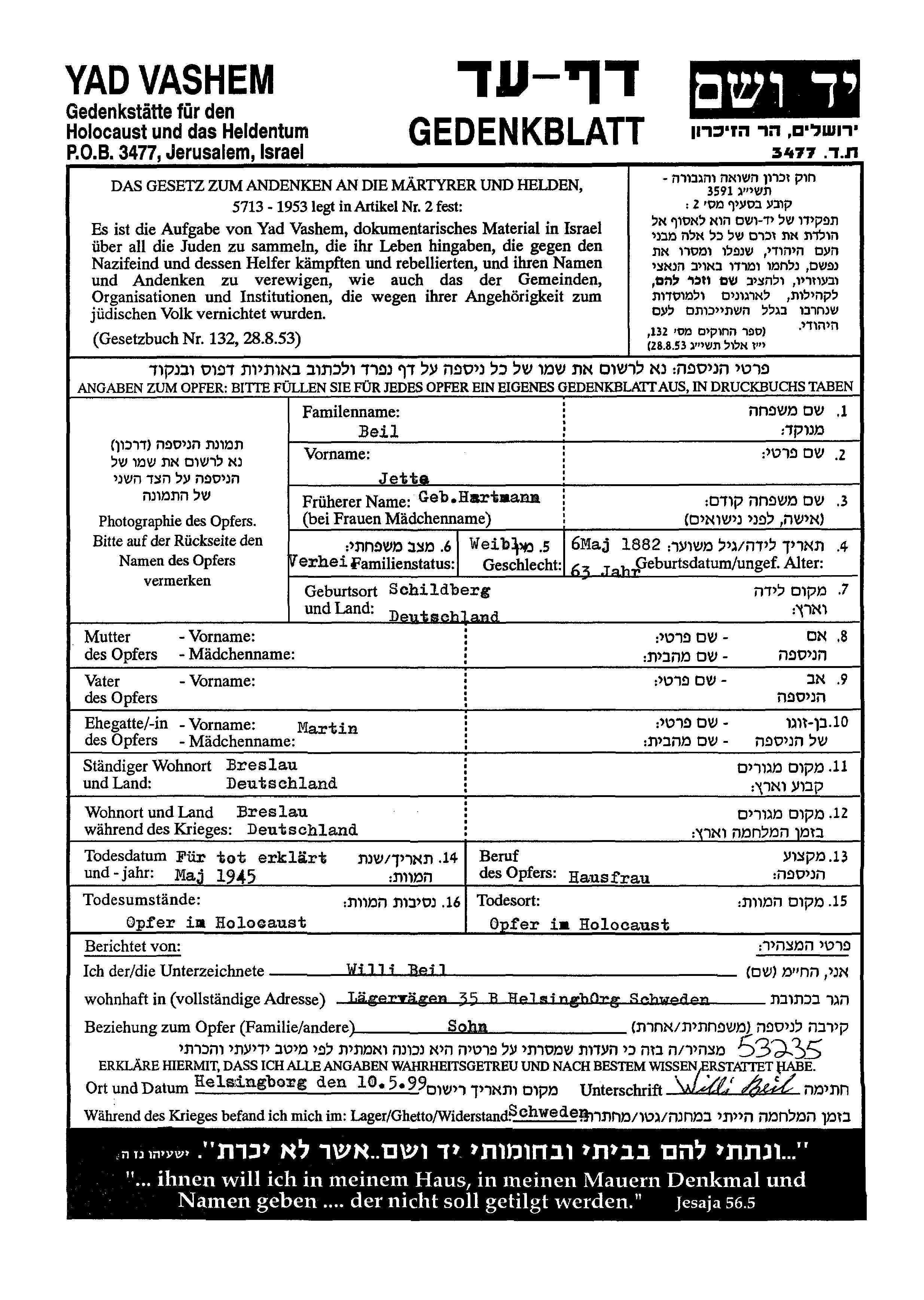 Jetta Beil nee Hartmann was born in Schildberg, Poland, 1882. She was a housewife and married to Martin. Prior to WWII she lived in Breslau, Germany. During the war she was in Breslau, Germany. Jetta was murdered in the Shoah.