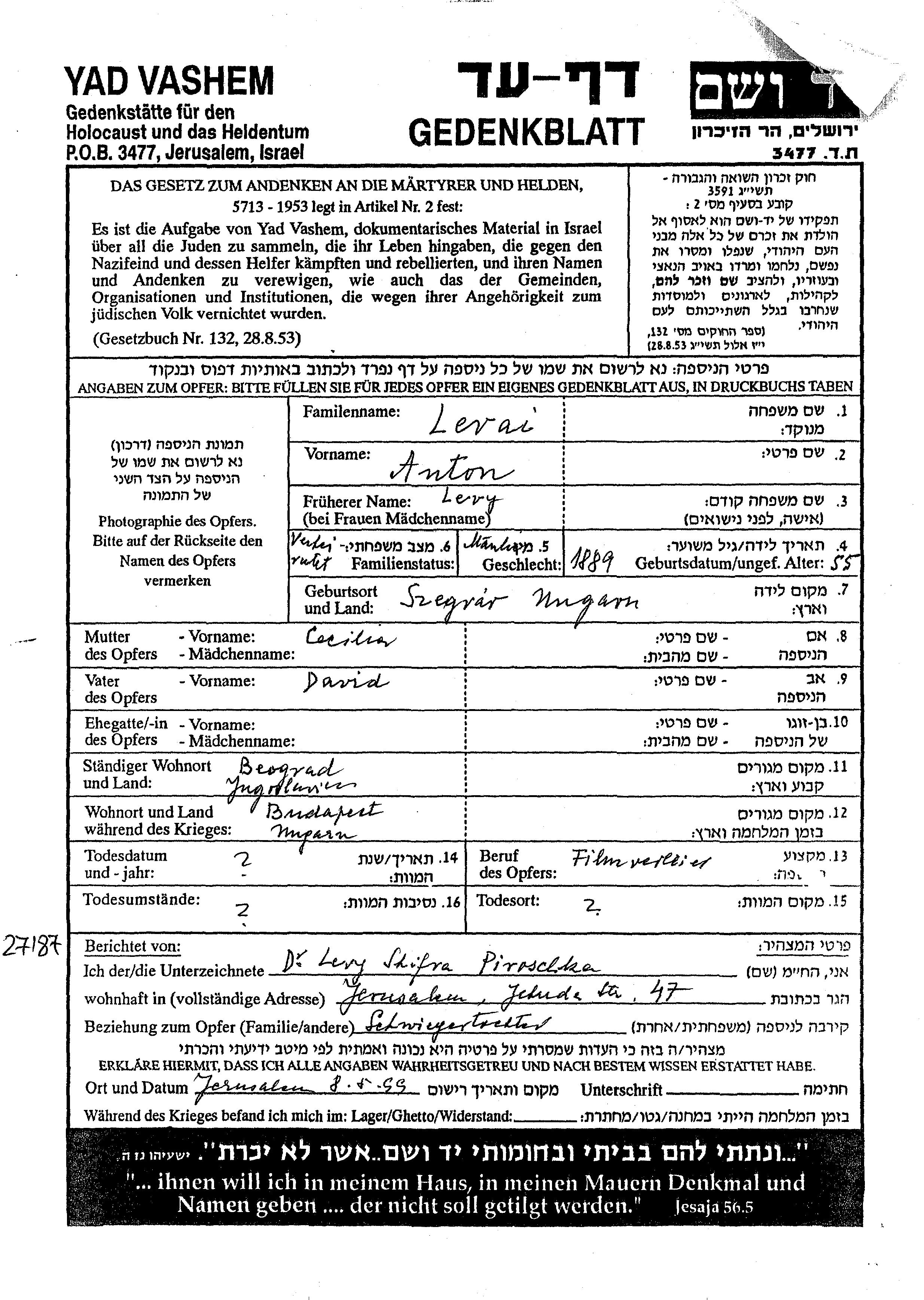 Anton Levai Levy was born in Szegvar, Hungary, 1889 to David and Cecilia. He was a projectionist and single. Prior to WWII he lived in Beograd, Yugoslavia. During the war he was in Budapest, Hungary. Anton was murdered in the Shoah.
