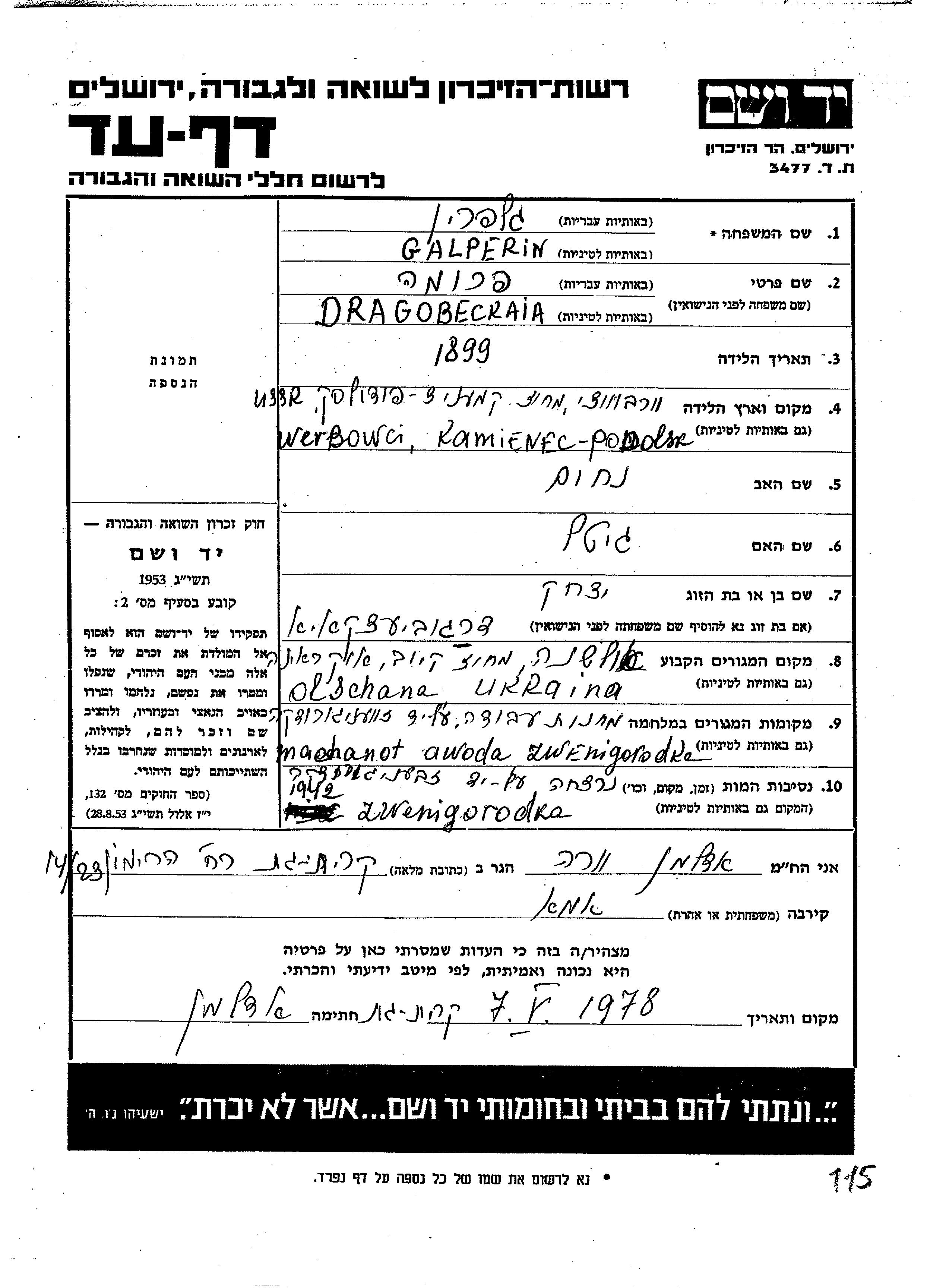 Fruma Galperin nee Dragobeckaia was born in Verbovets, Ukraine (USSR), 1899 to Nakhum and Gitel. She was married to Yitzkhak. Prior to WWII she lived in Olshana, Ukraine (USSR). During the war she was in Zwenigorodka, Ukraine (USSR). Fruma was murdered in the Shoah. Place of death: Zwenigorodka, Ukraine (USSR), 1942.