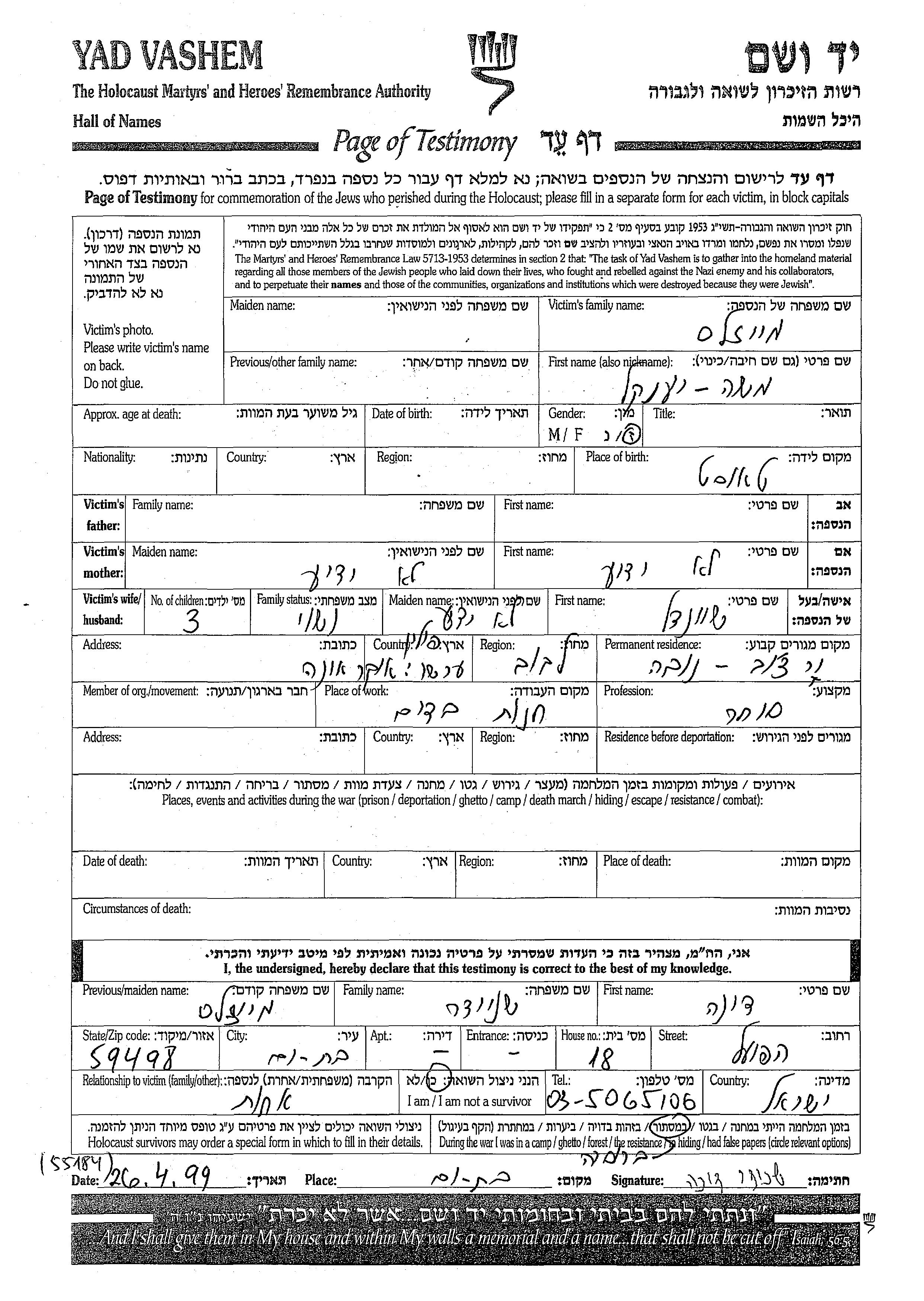 Yad Vashem - Pages of Testimony Names Memorial Collection