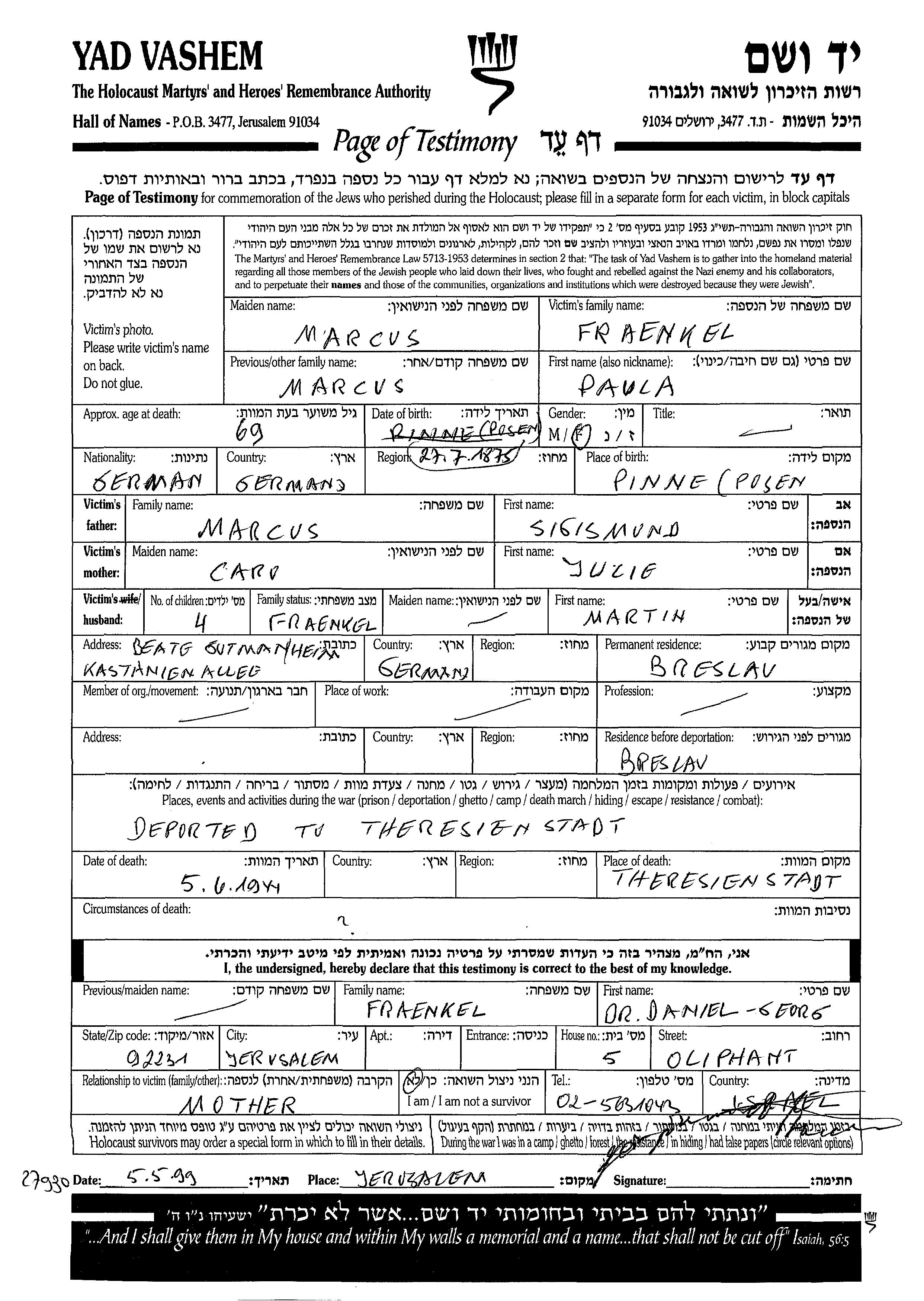 Paula Fraenkel nee Marcus was born in Pinne, Poland, 1875 to Sigismund and Julie. She was married to Martin nee Fraenkel. Prior to WWII she lived in Breslau, Germany. During the war she was in Breslau, Germany. Paula was murdered in the Shoah. Place of death: Theresienstadt, Czechoslovakia, 05/06/1944.