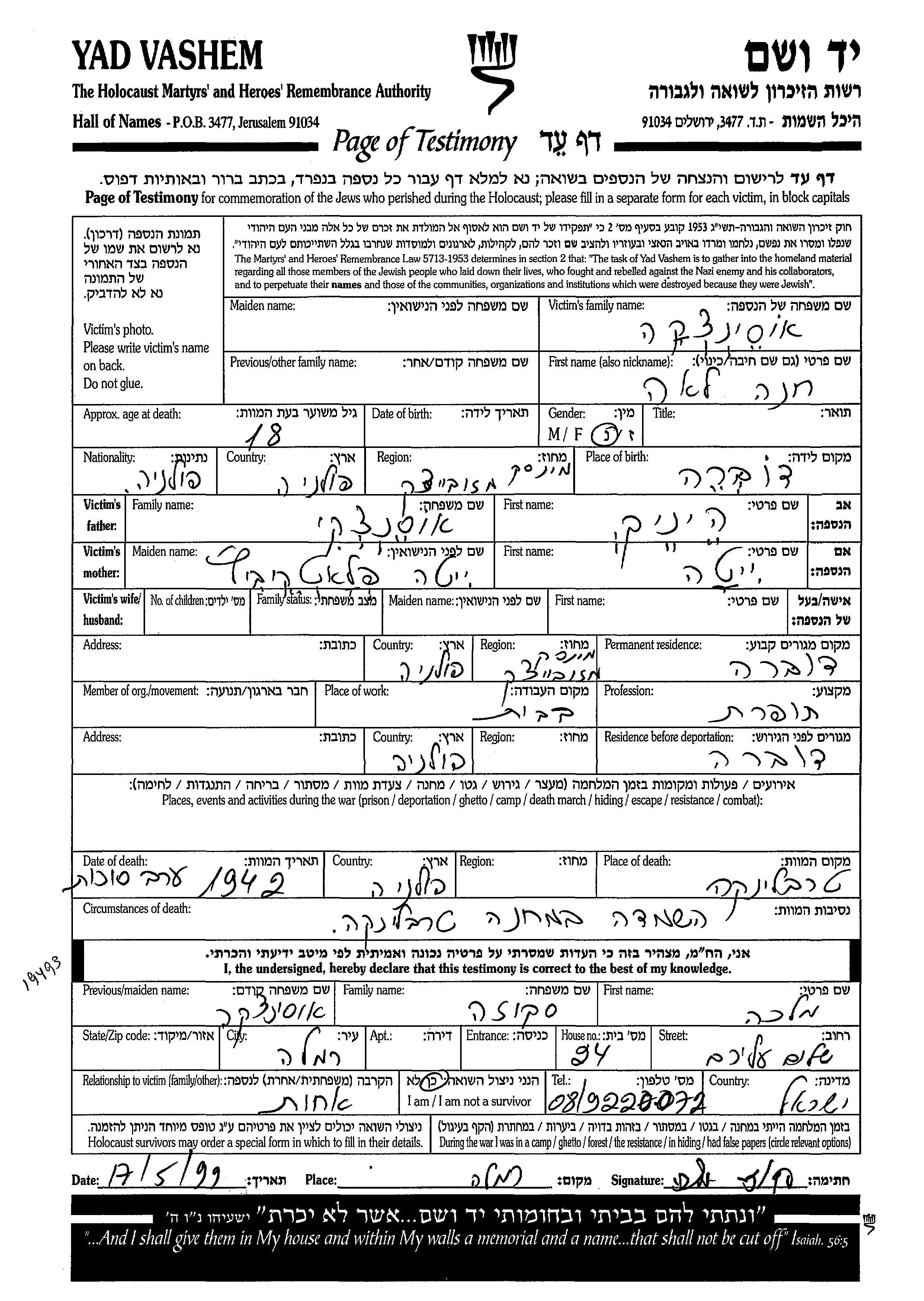 Osintzka Khana Lea Dobre, Poland Page of Testimony