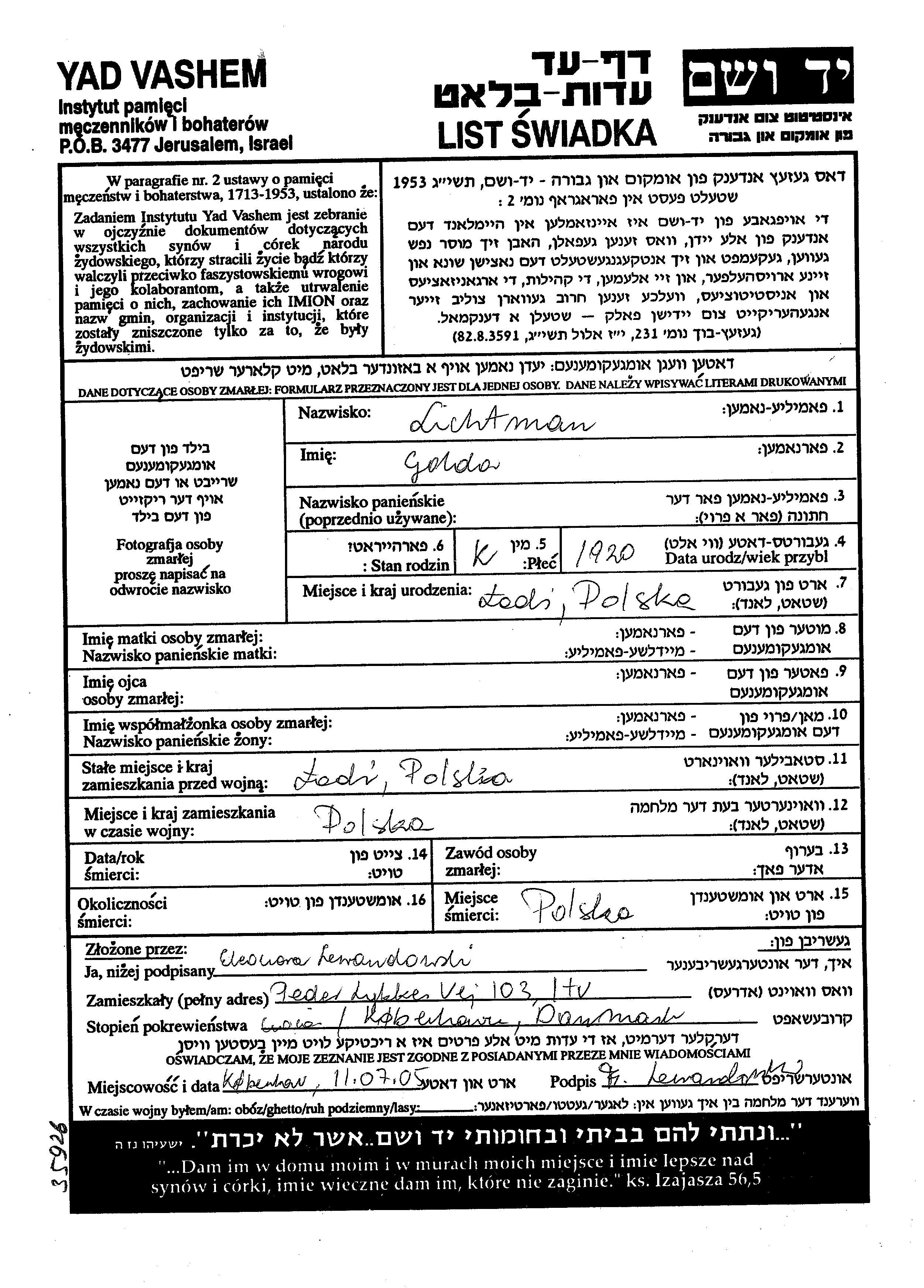 Lichtman Golda 1920 Lodz, Poland Page of Testimony
