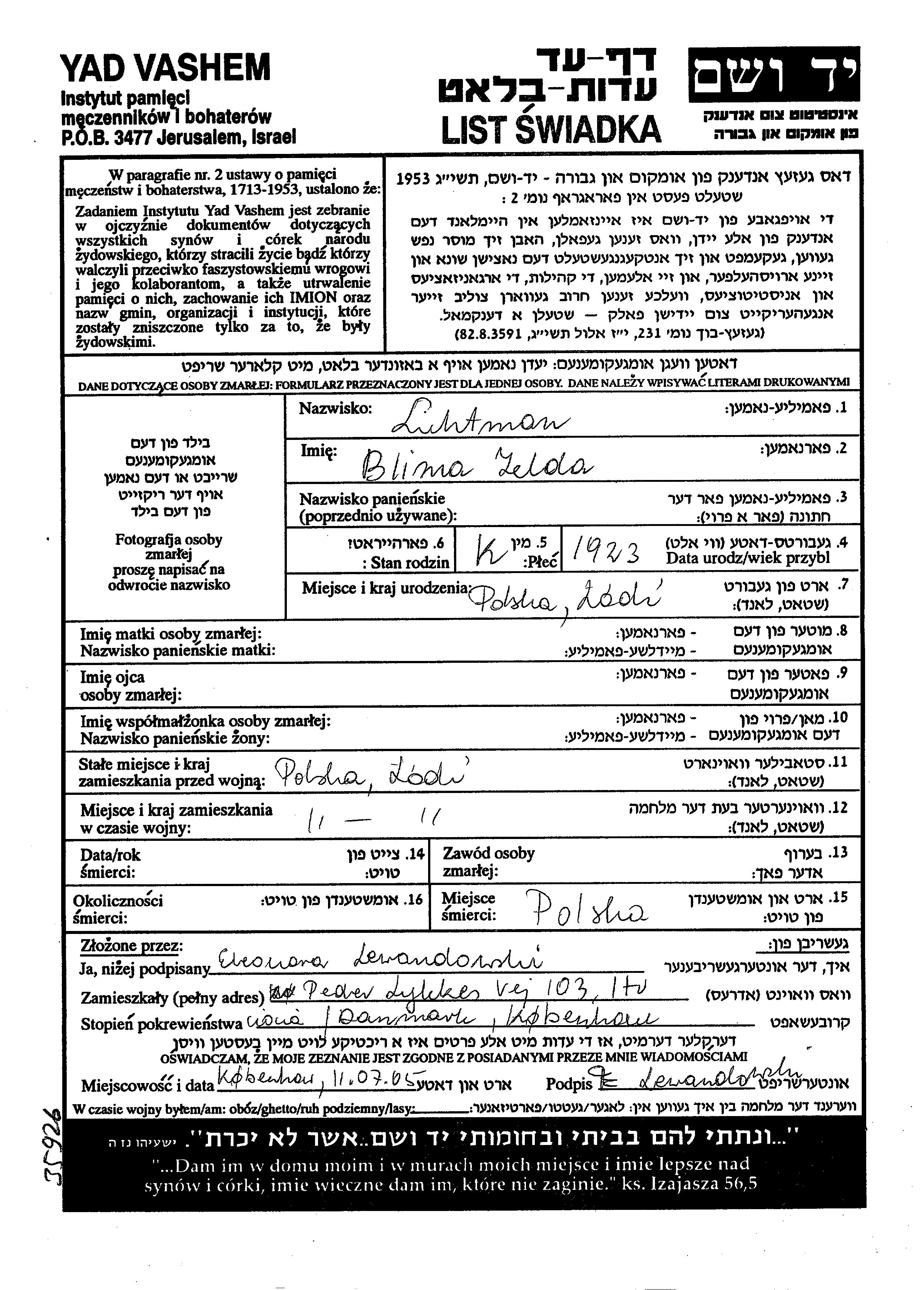 Lichtman Blima Zelda 1923 Lodz, Poland Page of Testimony