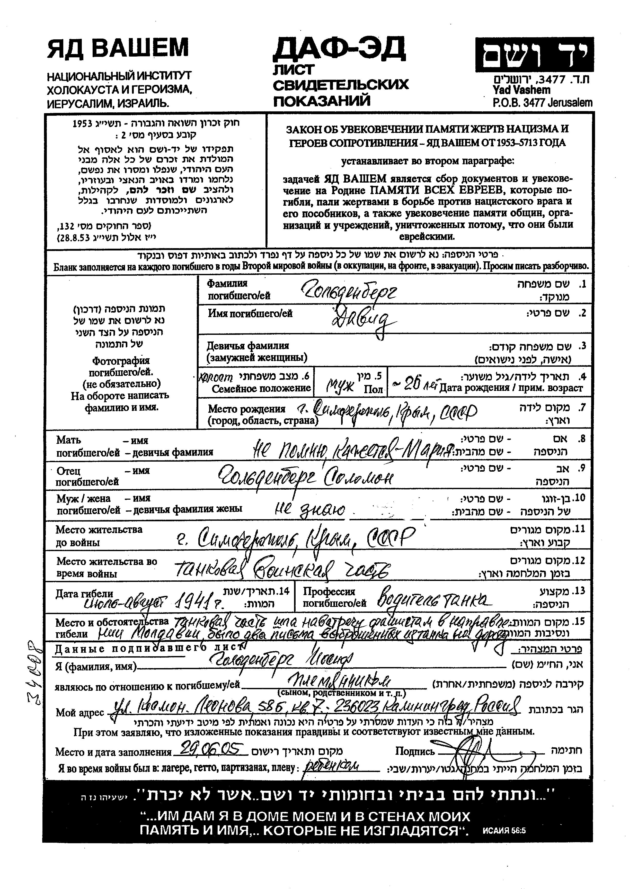 David Goldenberg was born in Simferopol, Russia (USSR) to Solomon and Mariya. He was a tank driver and single. Prior to WWII he lived in Simferopol, Russia (USSR). During the war he was in the Soviet armed forces. David was killed in military service in WWII. Place of death: unknown, 07/1941.
