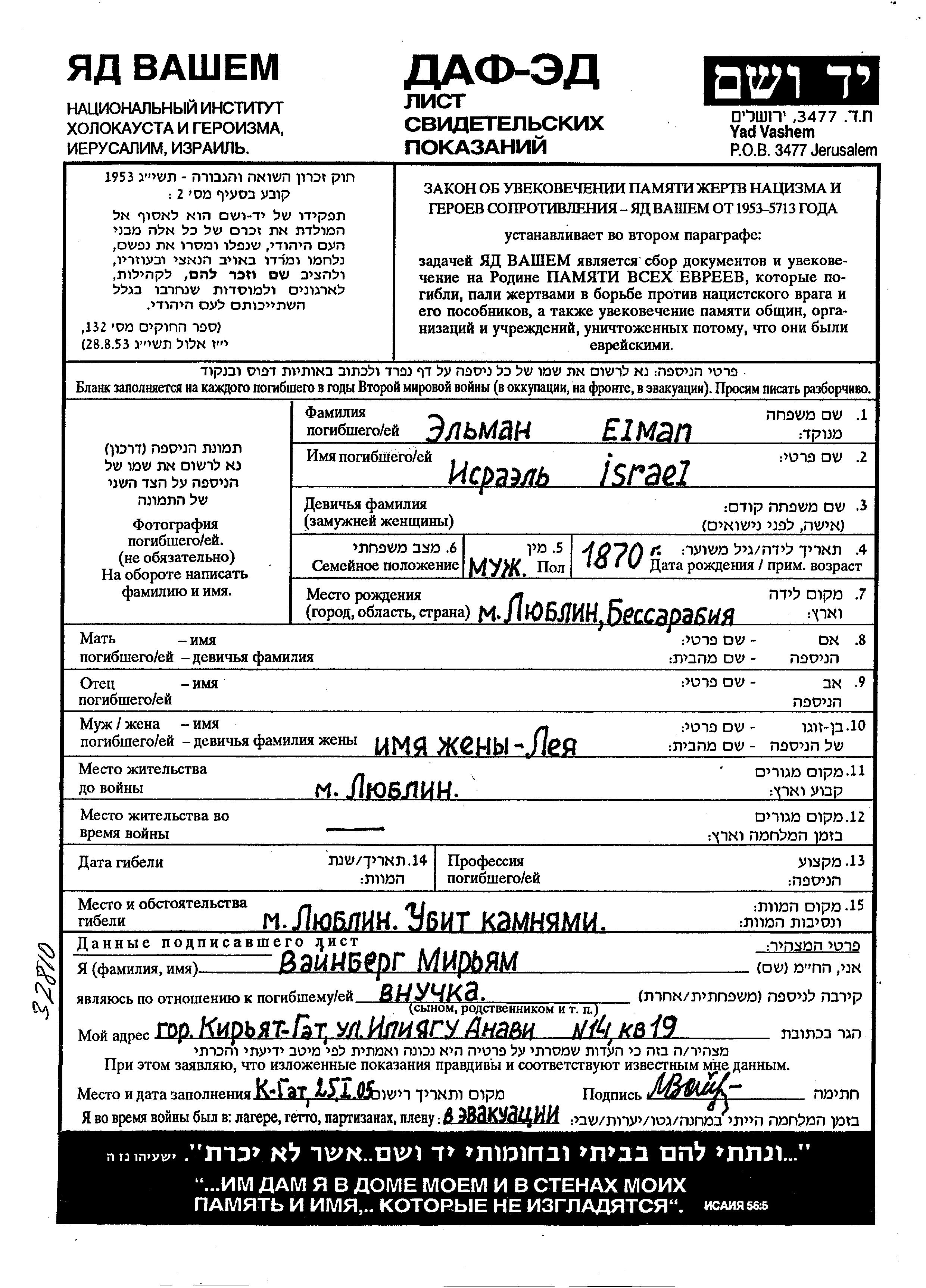 Israel Elman was born in Liublin, Romania, 1870. He was married to Leya. Prior to WWII he lived in Liublin, Romania. Israel was murdered in the Shoah. Place of death: Liublin, Romania.