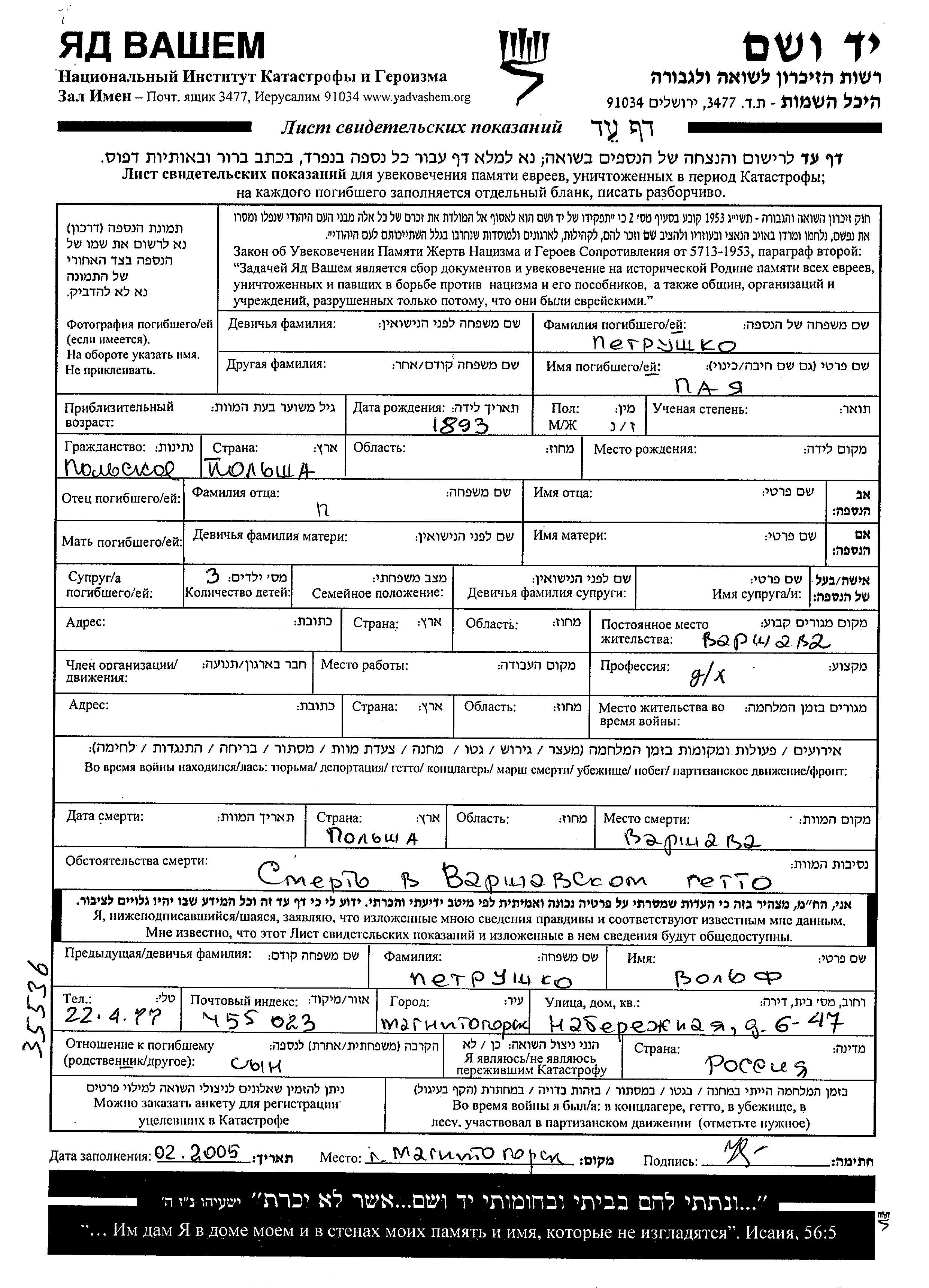 Petrushko Paya 1893 Warszawa, Poland Page of Testimony