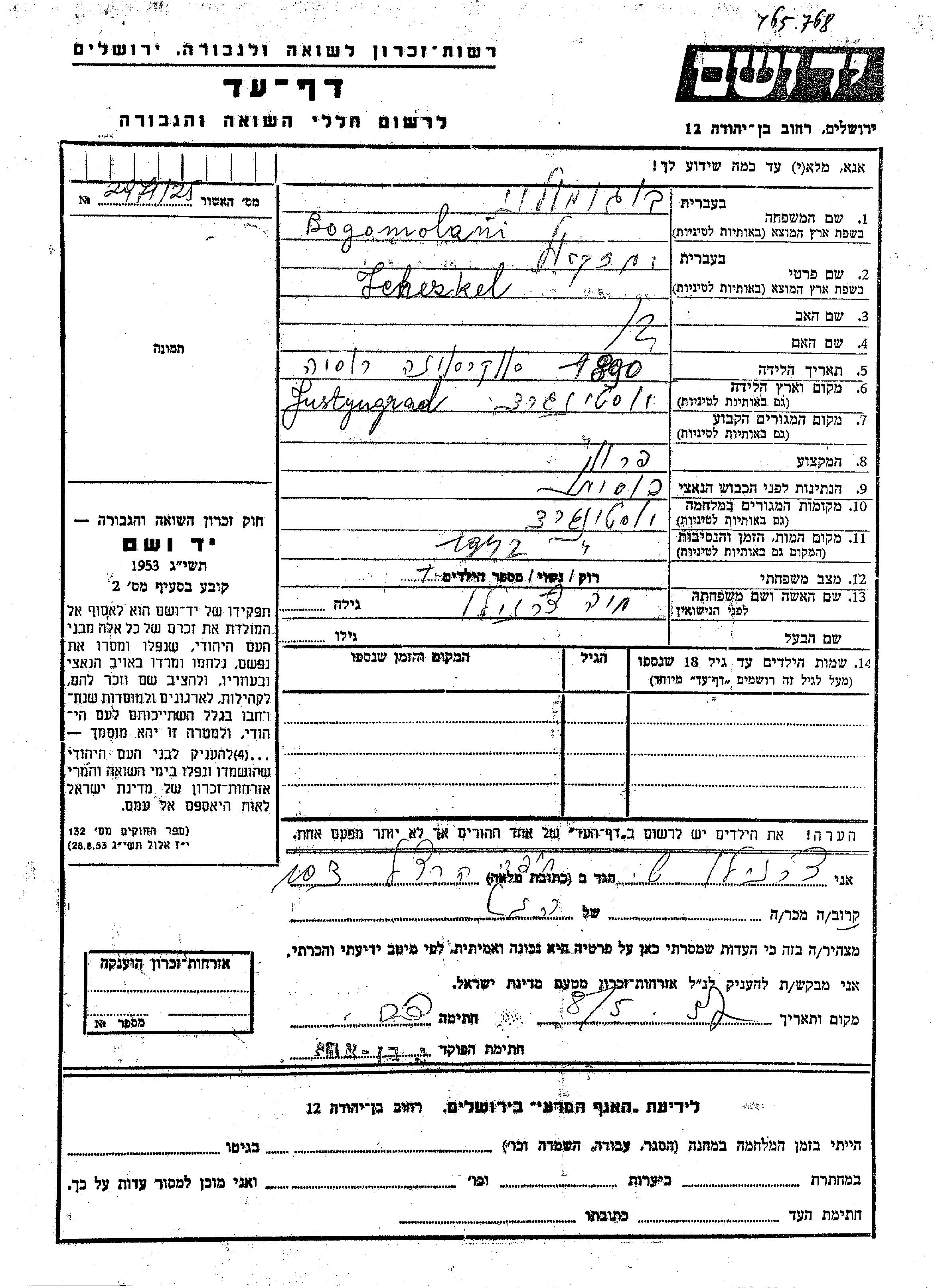 Ichezkel Bogomolni was born in Yustingrad, Ukraine (USSR), 1890. He was a furrier and married to Khaia nee Chernilo. Prior to WWII he lived in Yustingrad, Ukraine (USSR). During the war he was in Yustingrad, Ukraine (USSR). Ichezkel was murdered in the Shoah. Place of death: Yustingrad, Ukraine (USSR), 1942.