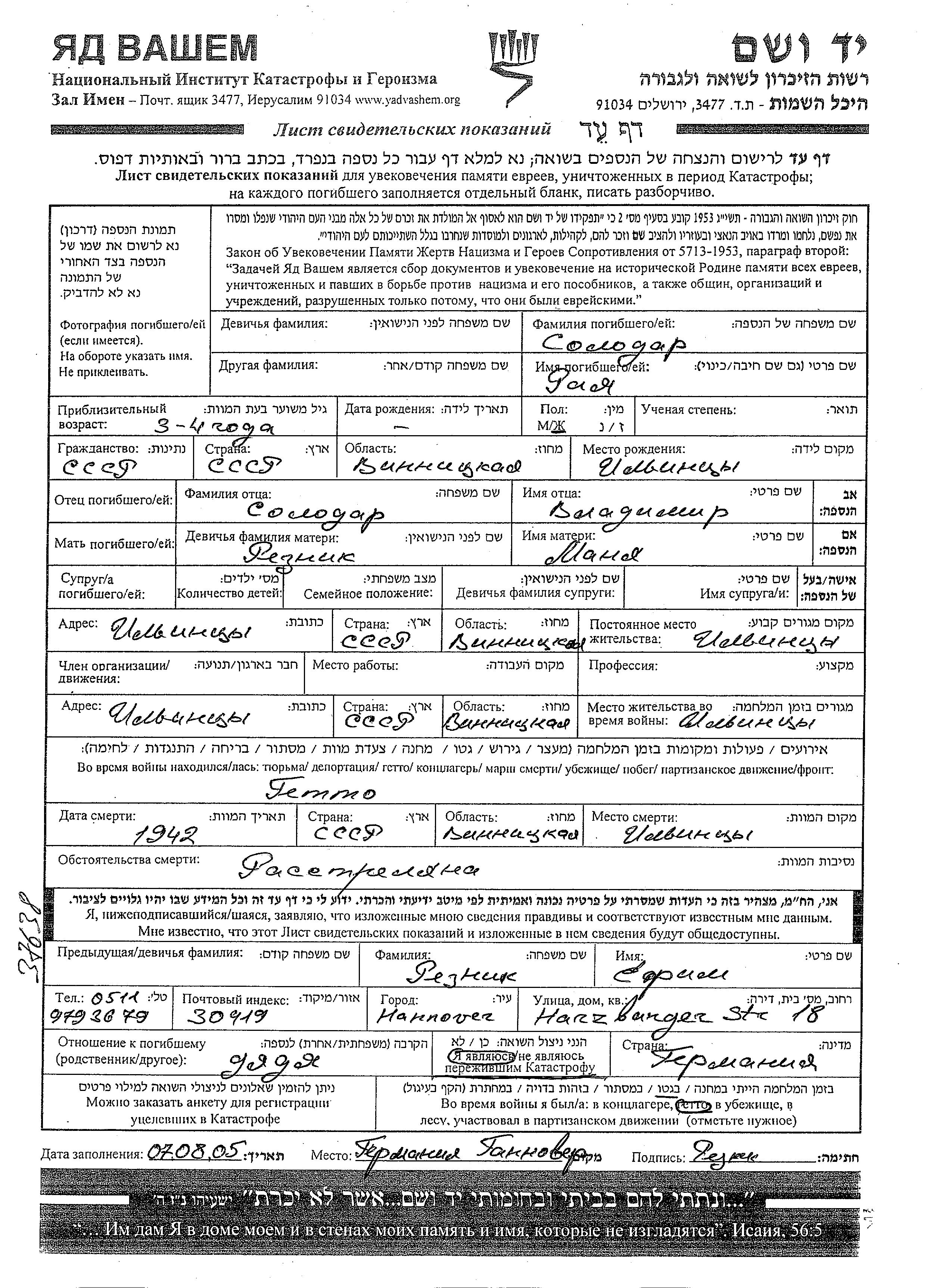 Raya Solodar was born in Ilyintsy, Ukraine (USSR) to Vladimir and Manya nee Reznik. She was child. Prior to WWII she lived in Ilyintsy, Ukraine (USSR). During the war she was in Ghetto. Raya was murdered in the Shoah. Place of death: Ilyintsy, Ukraine (USSR), 1942.