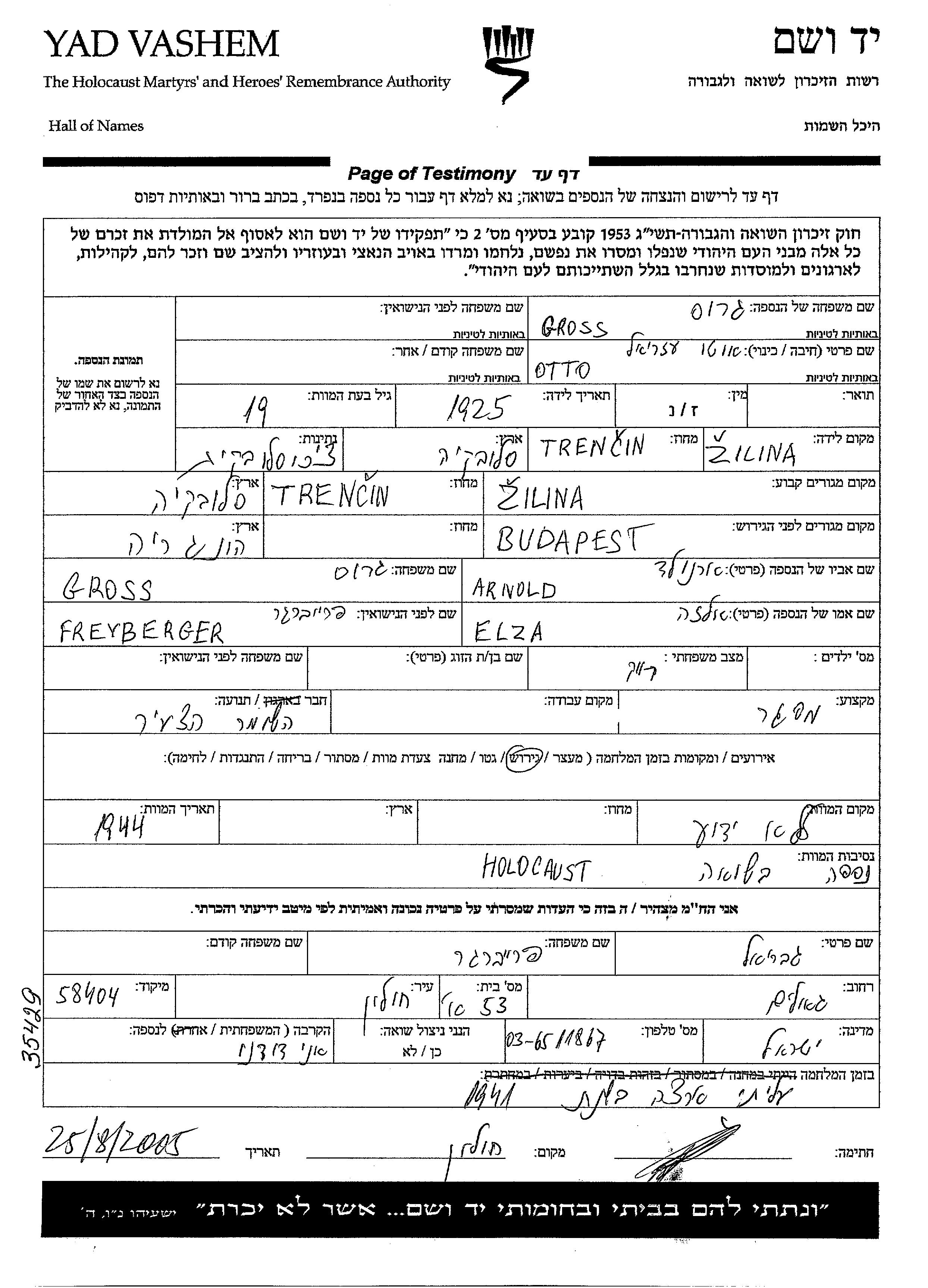 Azriel Otto Gros was born in Zilina, Czechoslovakia, 1925 to Arnold and Elza nee Freyberger. He was a metalworker and single. Prior to WWII he lived in Zilina, Czechoslovakia. During the war he was in Budapest, Hungary. Azriel Otto was murdered in the Shoah. Place of death: unknown, 1944.