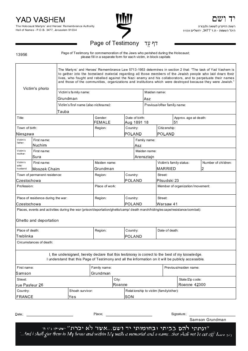 Tauba Grundman nee Asz was born in Nieszawa, Poland, 1891 to Nuchim and Sura nee Arensztajn. She was married to Moszek Chaim nee Grundman. Prior to WWII she lived in Czestochowa, Poland. During the war she was in Czestochowa, Poland. Tauba was murdered in the Shoah. Place of death: Treblinka, Poland.