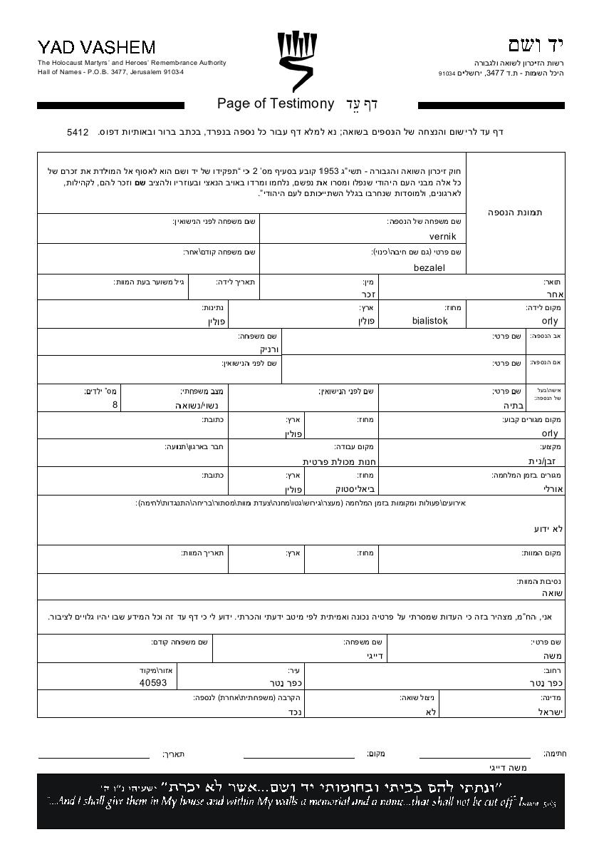 Bezalel Vernik was born in Orly, Poland. He was a sales person and married to Batia. Prior to WWII he lived in Orly, Poland. During the war he was in Orly, Poland. Bezalel was murdered in the Shoah.