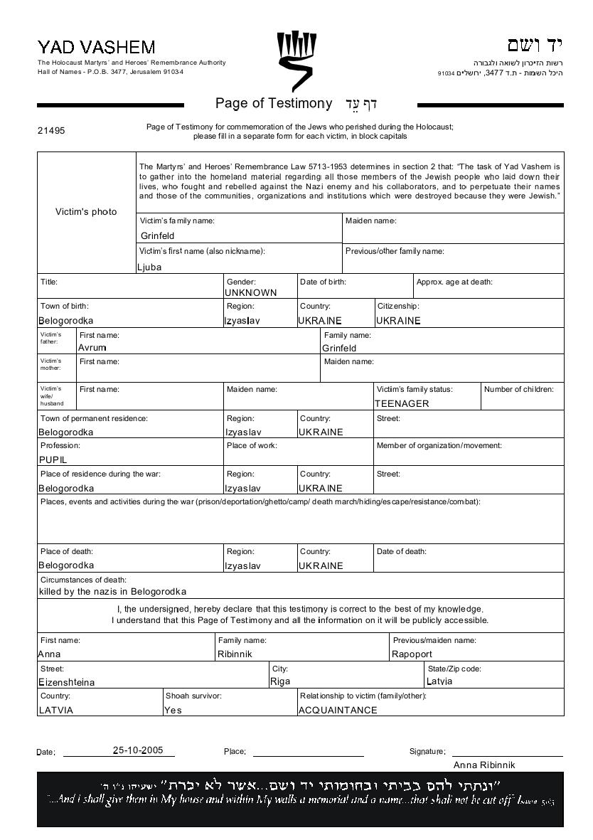 Ljuba Grinfeld was born in Belogorodka, Ukraine (USSR) to Avrum. She was a pupil and teenager. Prior to WWII she lived in Belogorodka, Ukraine (USSR). During the war she was in Belogorodka, Ukraine (USSR). Ljuba was murdered in the Shoah. Place of death: Belogorodka, Ukraine (USSR).