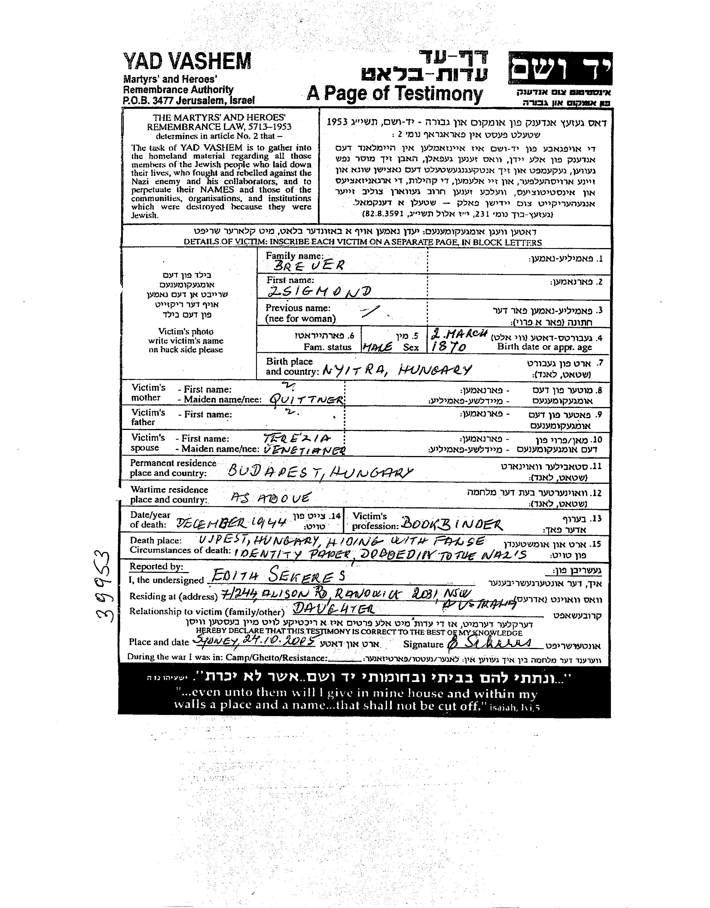 Breuer Zsigmond 1870 Budapest, Hungary Page of Testimony