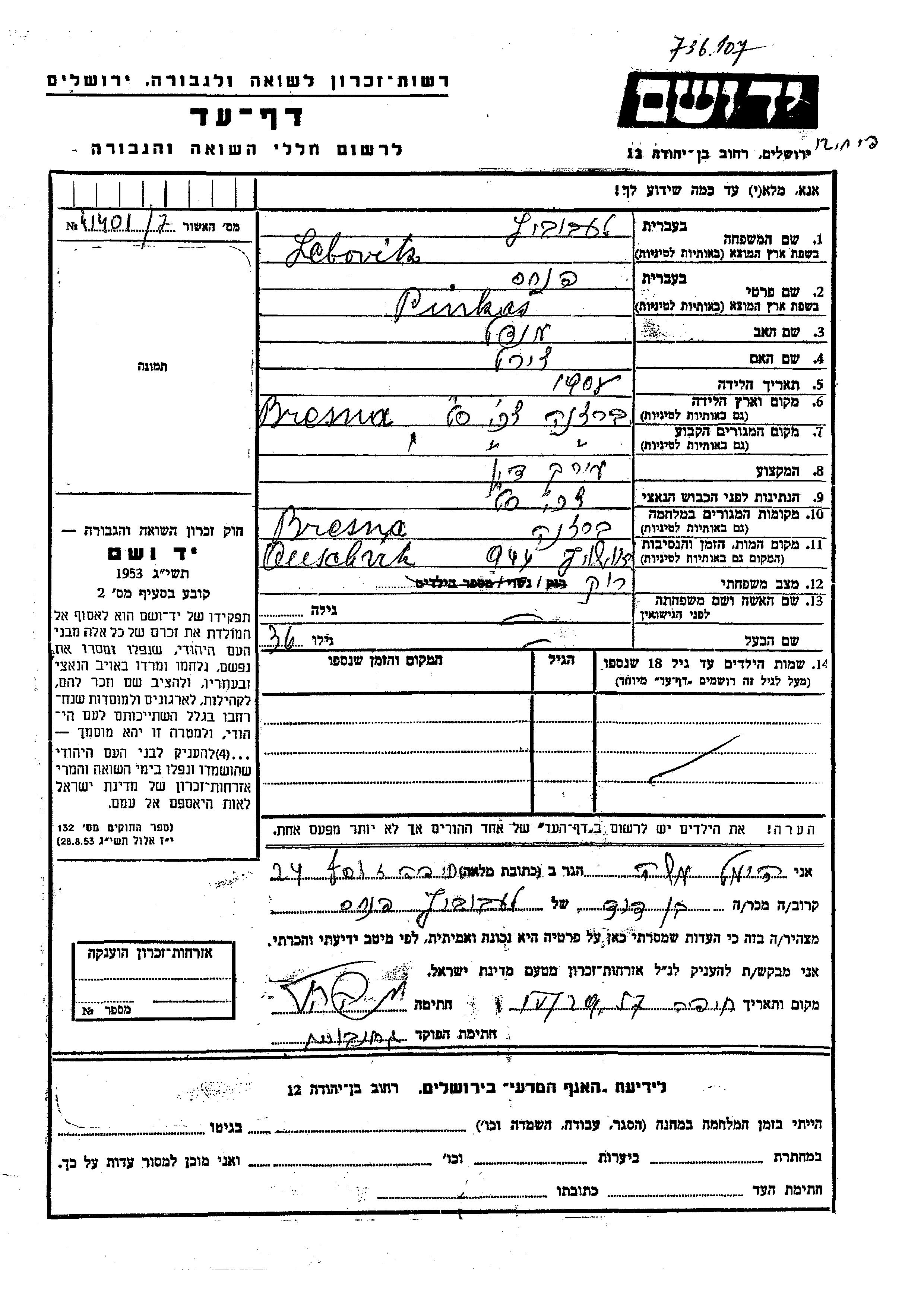 Lebovitz Pinkas 1908 Bresna, Czechoslovakia Page of Testimony