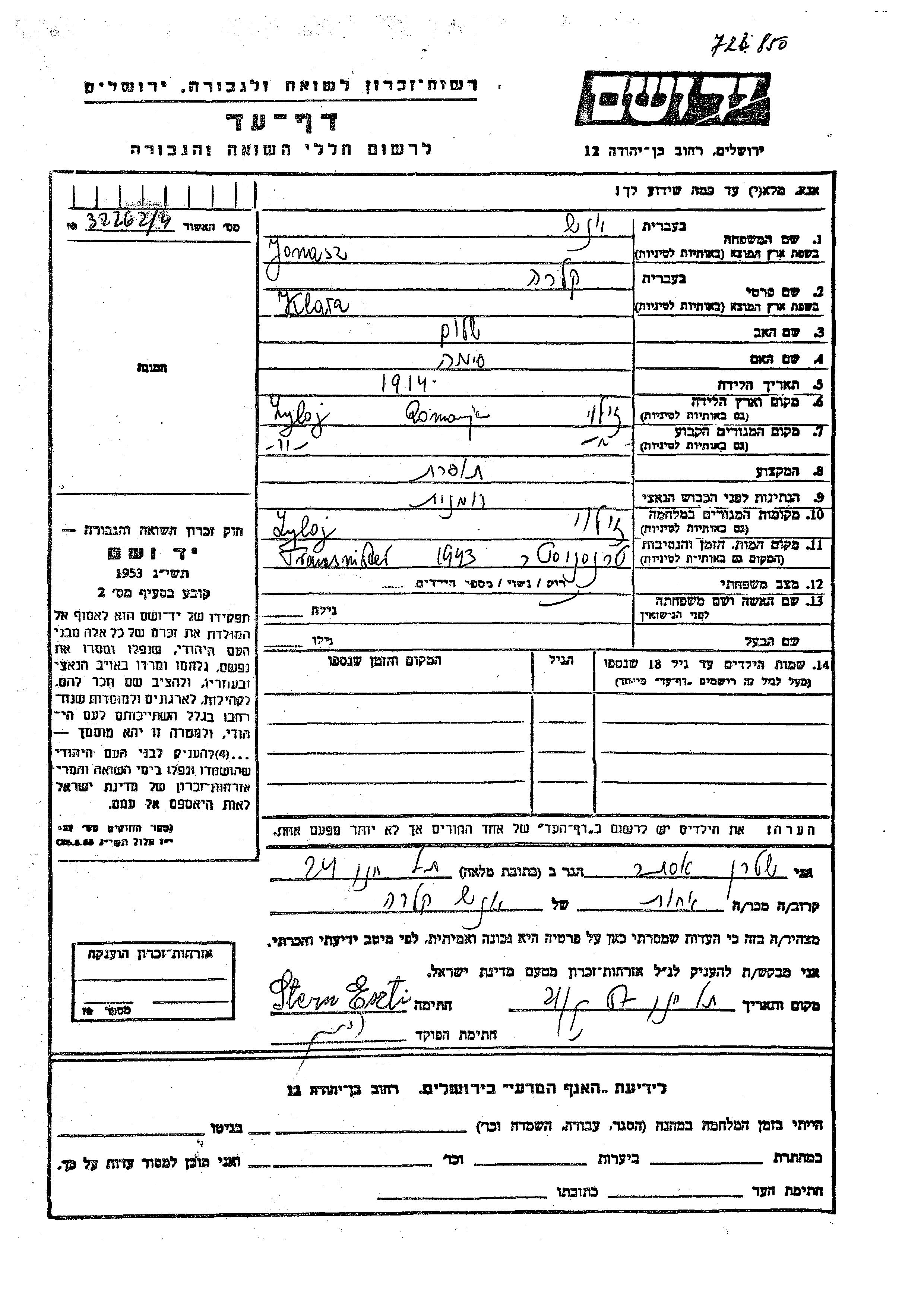 Jonasz Klara 1914 Zyloj, Romania Page of Testimony