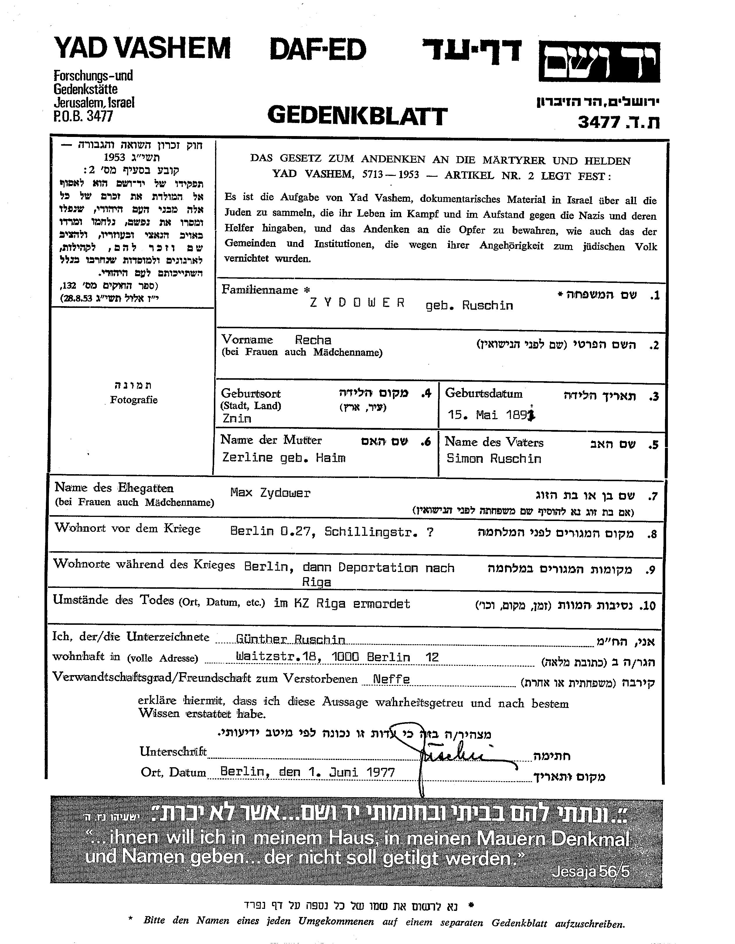 Recha Zydower nee Ruschin was born in Znin, Poland, 1891 to Simon and Zerline. She was married to Max. Prior to WWII she lived in Berlin, Germany. During the war she was in Berlin, Germany. Recha was murdered in the Shoah. Place of death: Riga, Latvia.