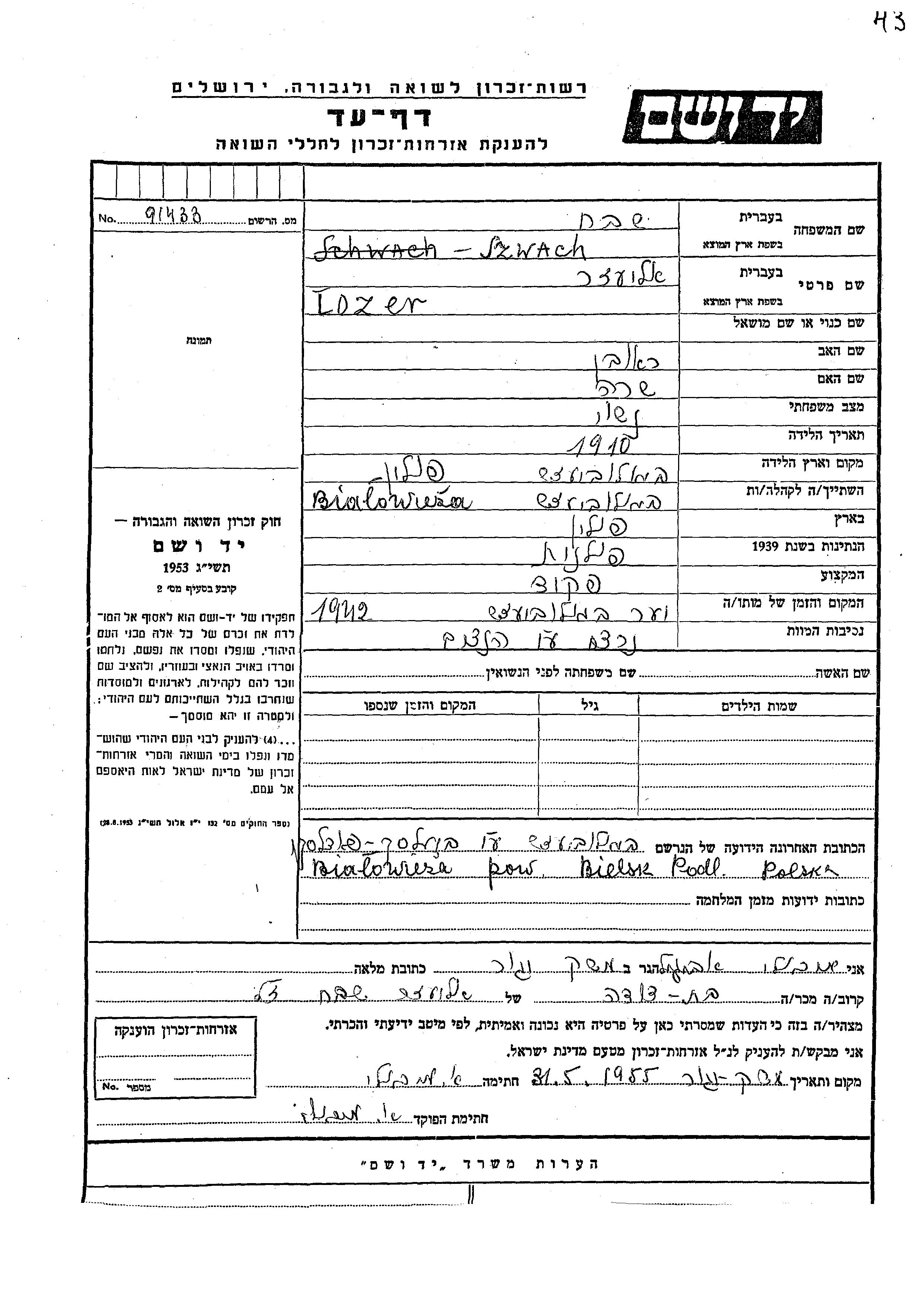 Lozer Szwach Shevakh was born in Bialowieza, Poland, 1910 to Reuven and Sara. He was a clerk and married. Prior to WWII he lived in Bialowieza, Poland. Lozer was murdered in the Shoah. Place of death: Bialowieza, Poland, 1942.