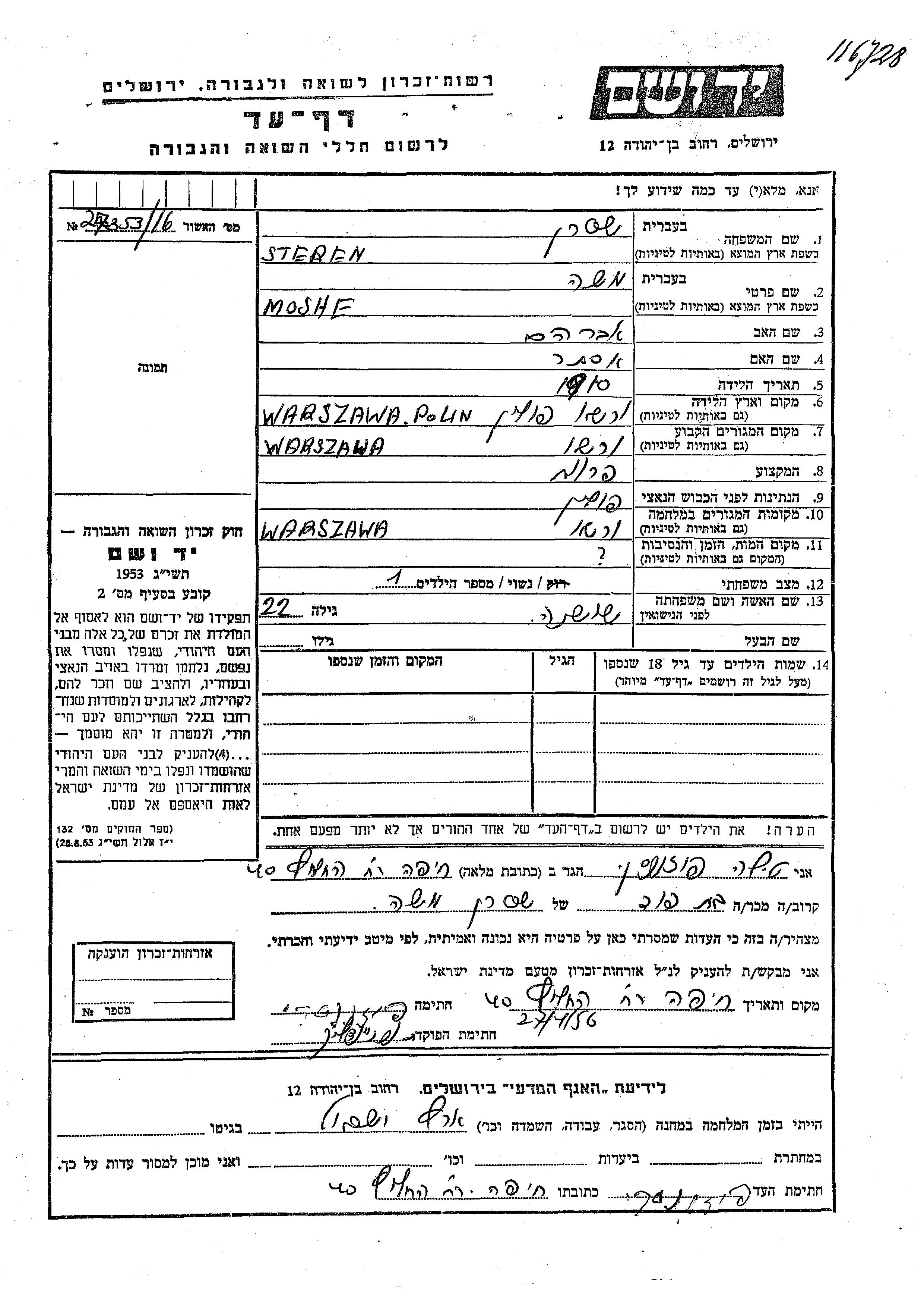 Steren Moshe 1910 Warszawa, Poland Page of Testimony
